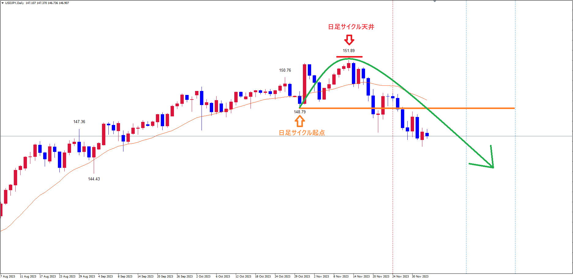 日足サイクルは、起点オレンジのライン(10/30の安値148.79)から、現在27本目です。