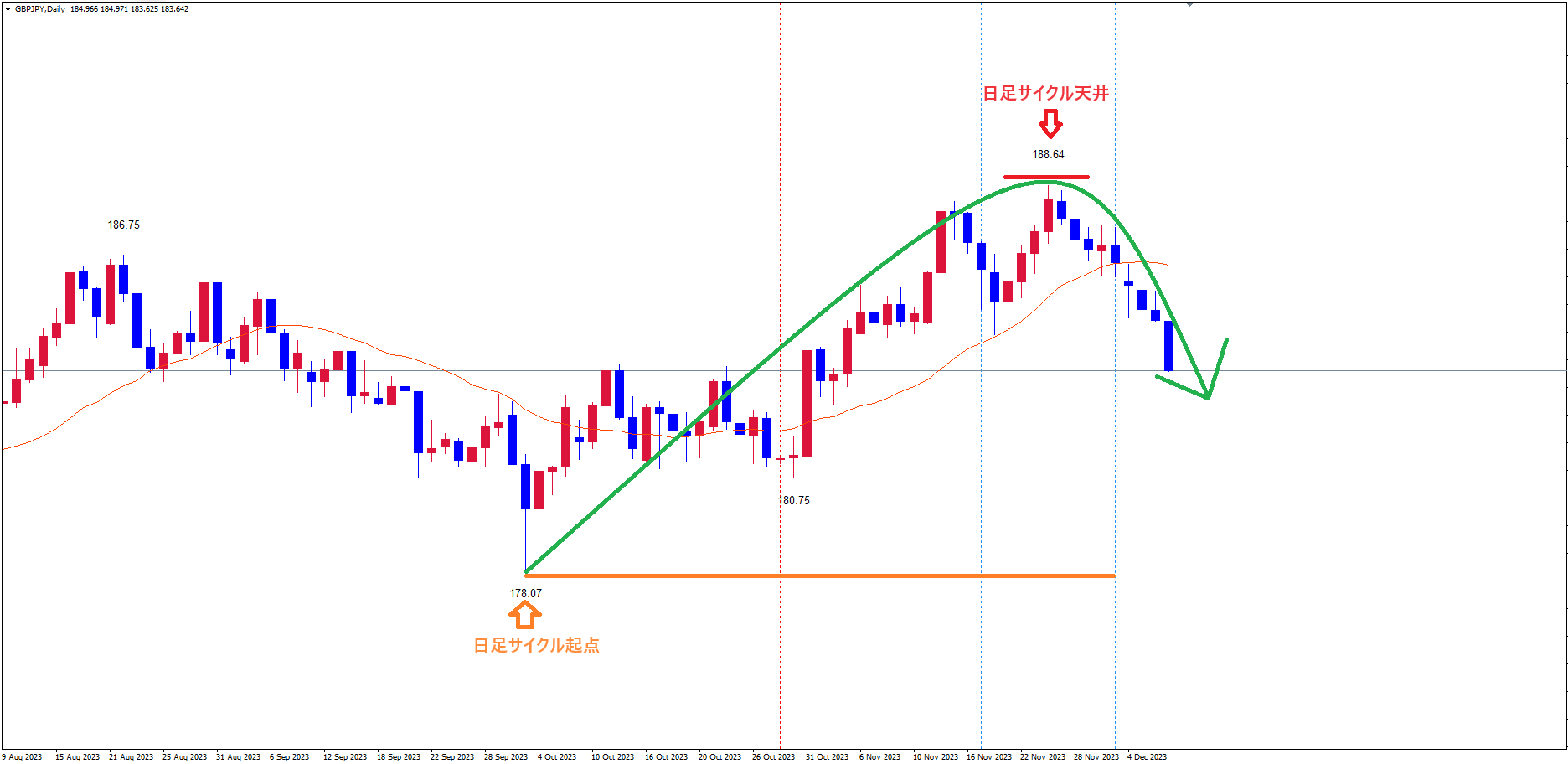 このサイクルは、起点青のライン(10/30の安値180.75)から現在29本目です。