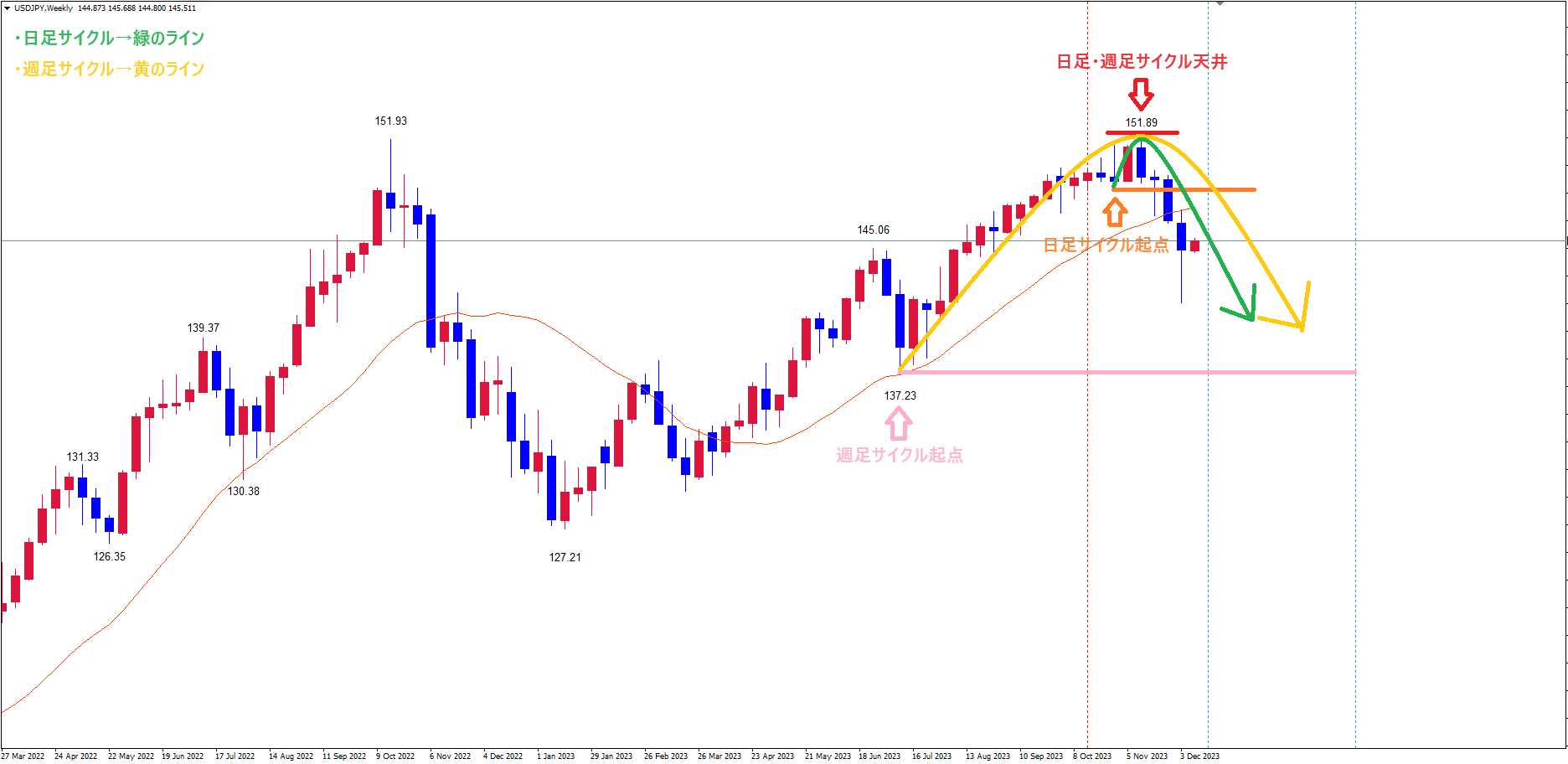 週足サイクルは、起点桃のライン(7/14の安値137.23)から、現在23本目です。