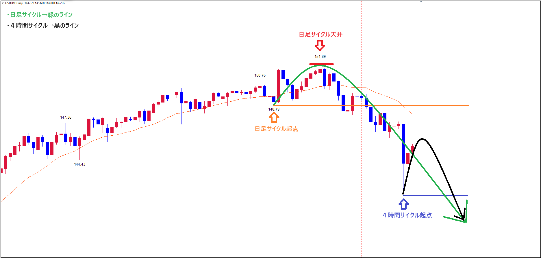上記で解説した様に、日足サイクルがレフトトランスレーションのサイクル(週足レベルで、押し安値割れの動き)を形成するので、