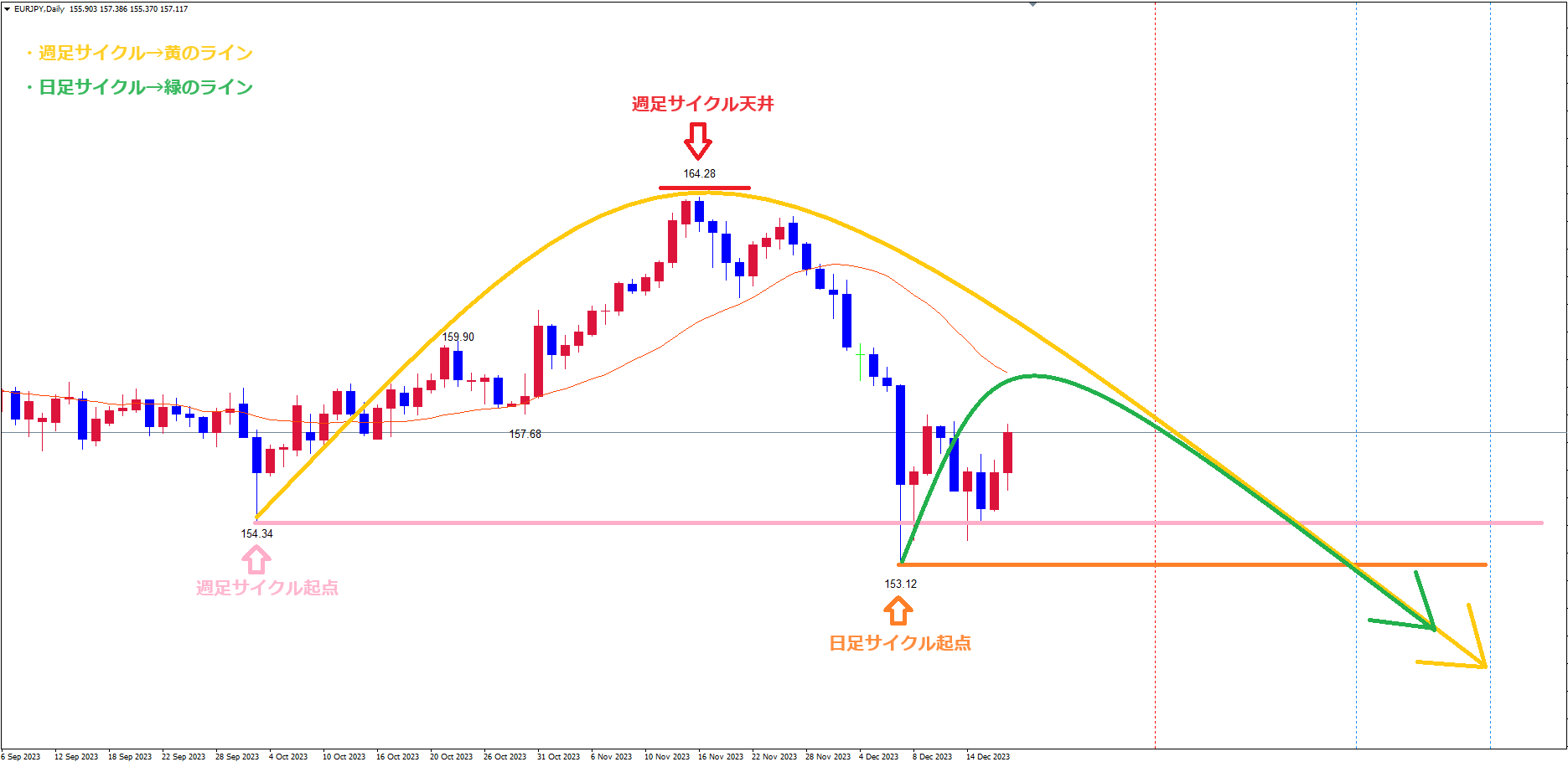 今回はユーロ円の日足・週足のサイクル的認識とパターン&イメージがどうなるかについて解説していきます。
