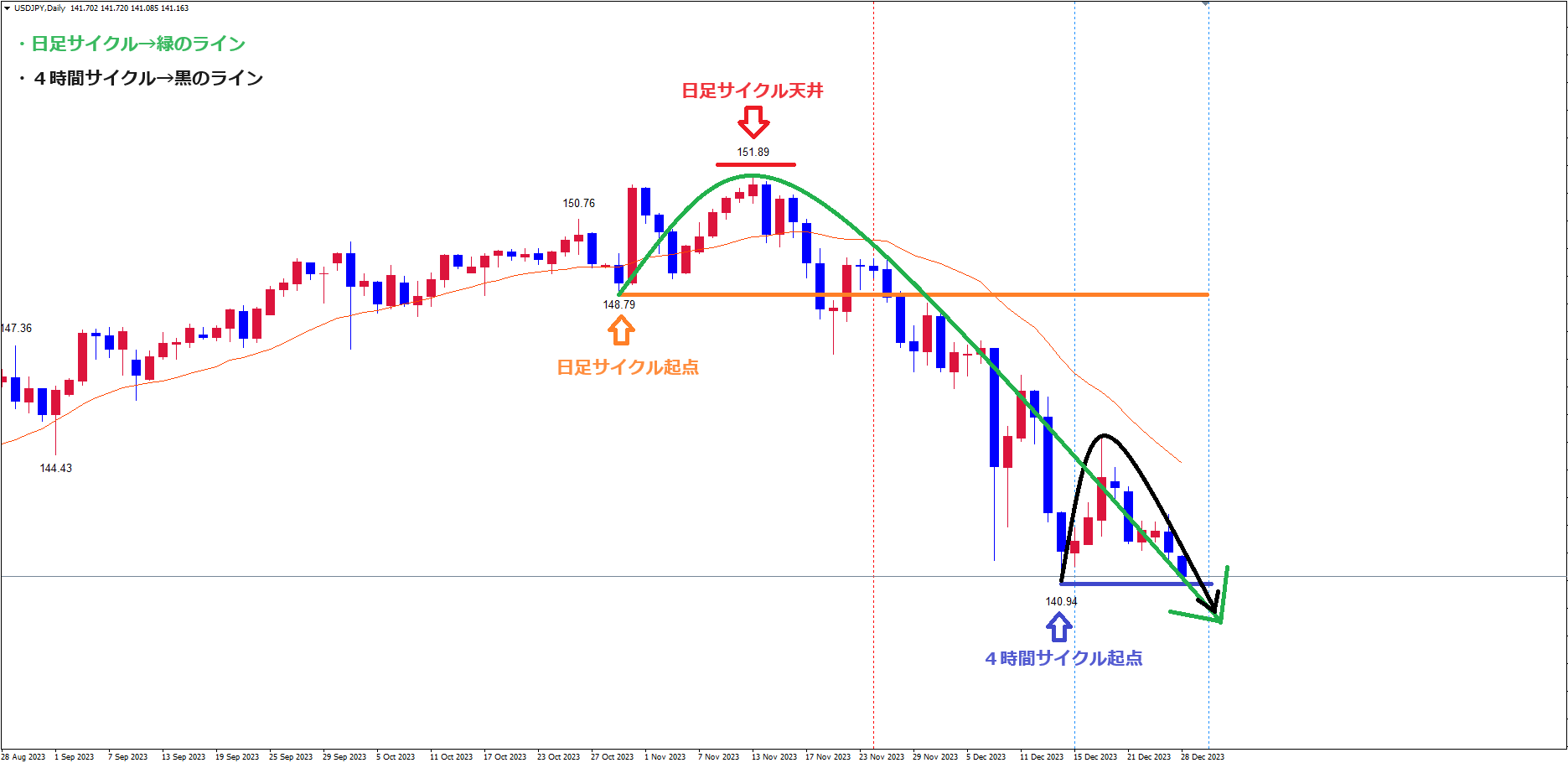 日足サイクルは、起点オレンジのライン(10/30の安値148.79)から、現在43本目です。