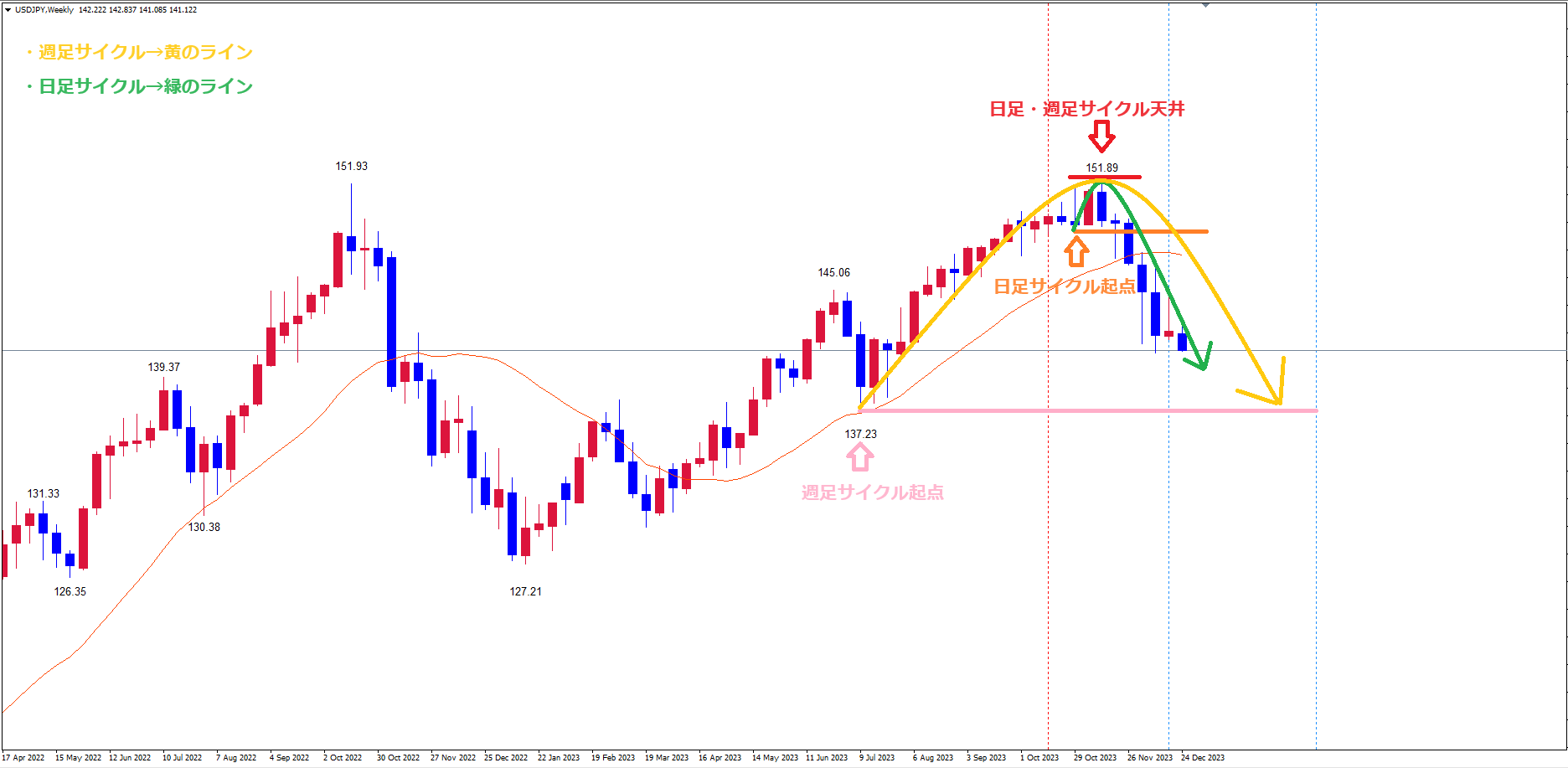 週足サイクルは、起点桃のライン(7/14の安値137.23)から、現在25本目です。