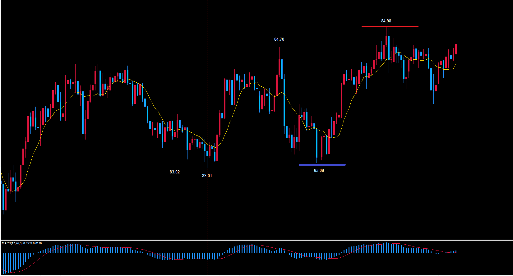 高値84.98を28本目に付けているという事は中央よりも左側で高値を付けているのでレフトトランスレーション想定で見ています。