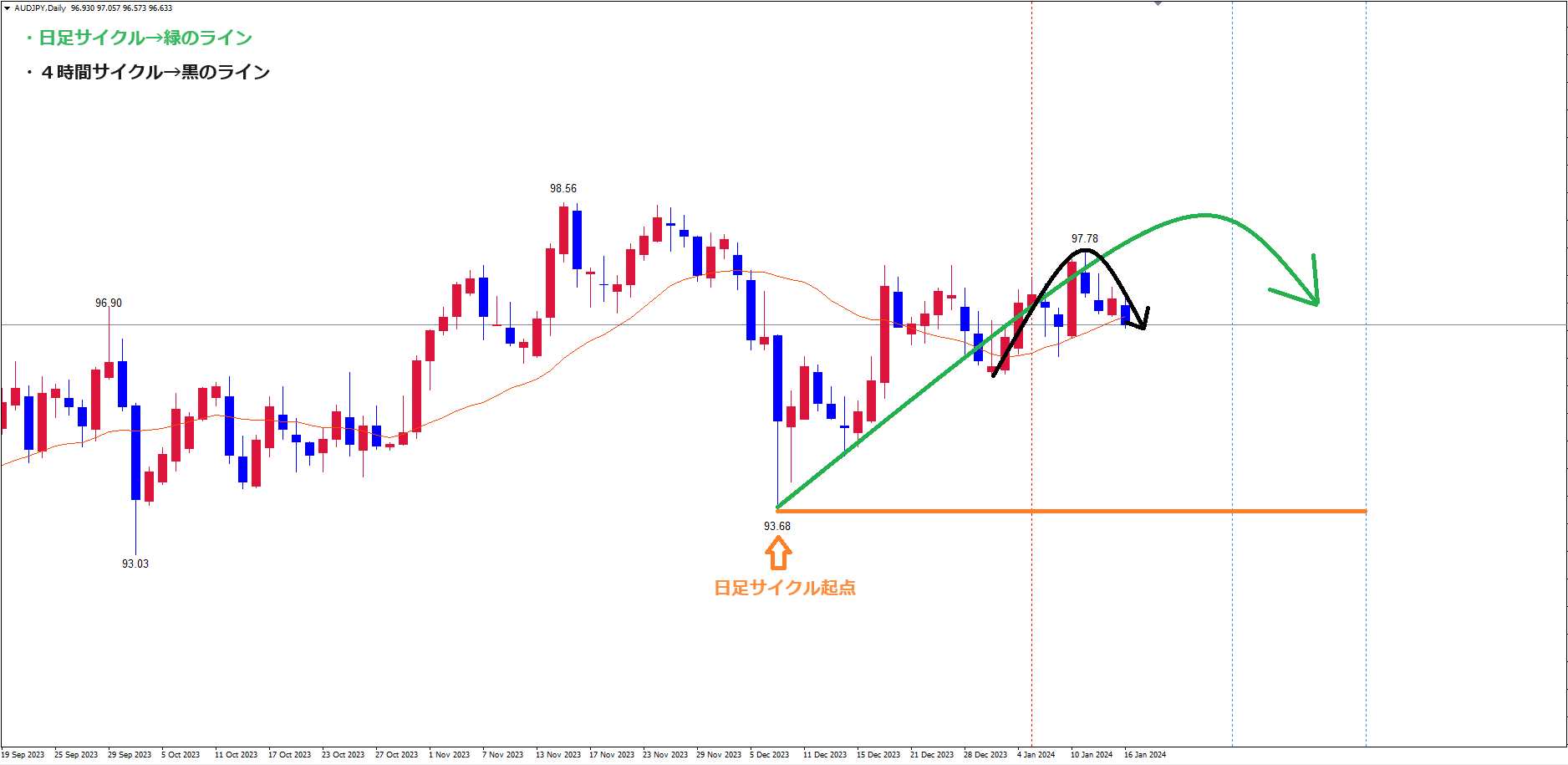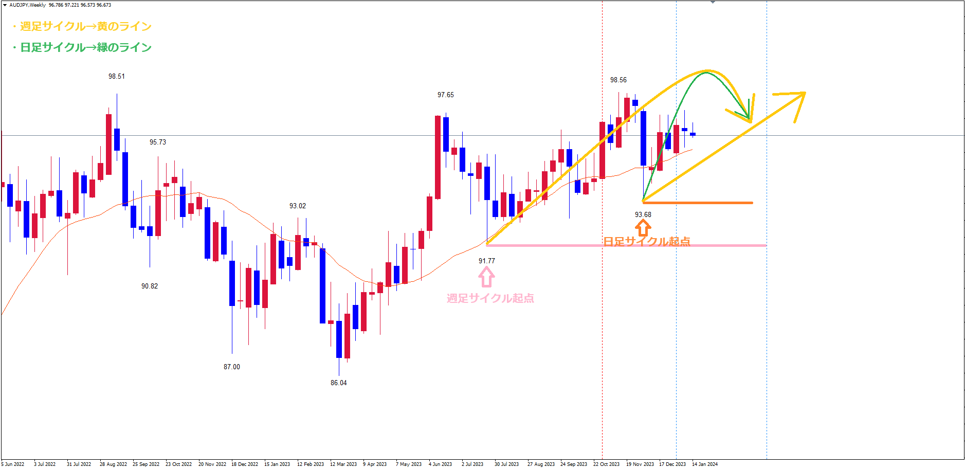 ・今回の日足サイクルが98.56を超えて天井を付ける場合、桃のラインが起点の週足サイクル