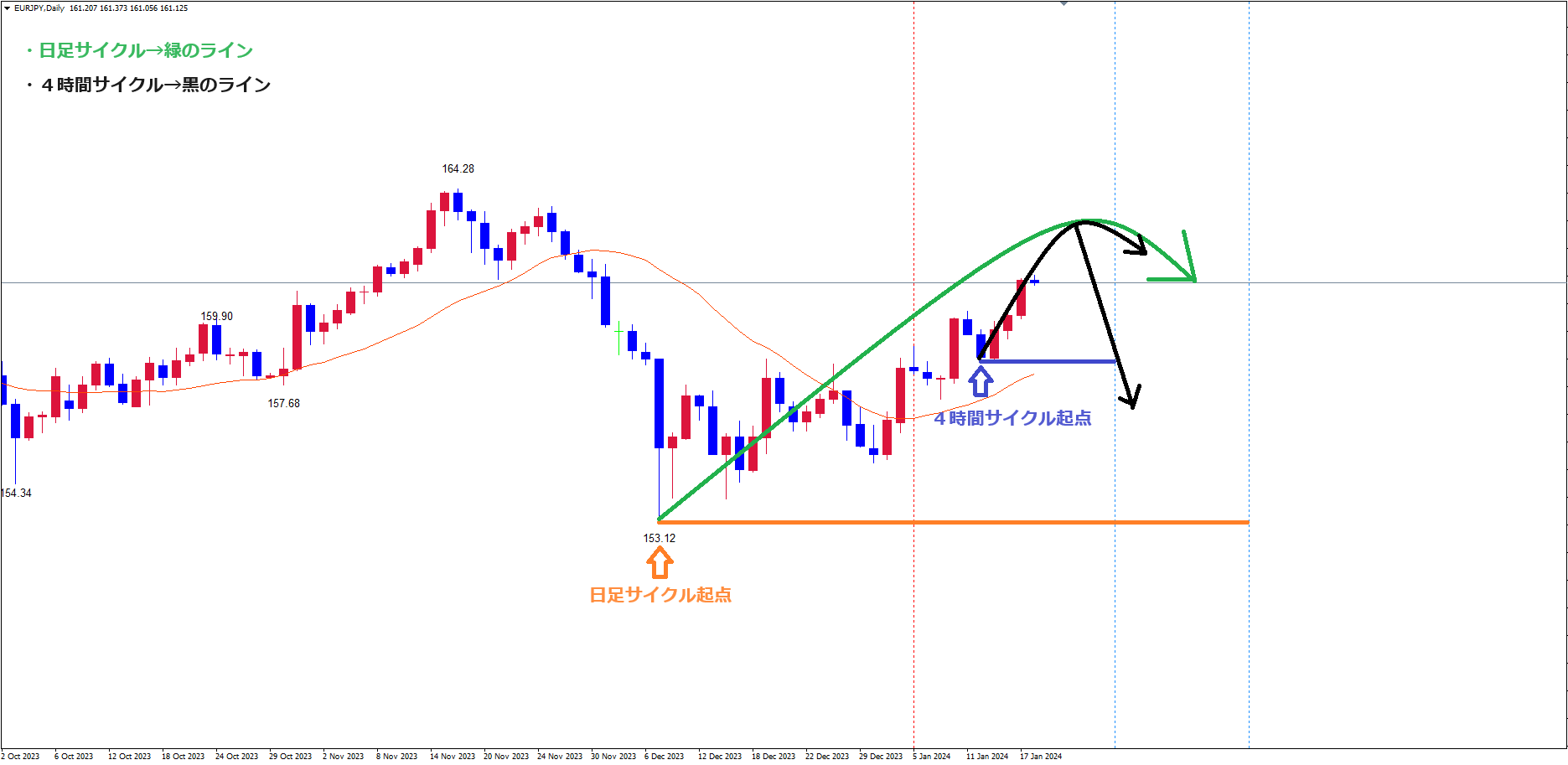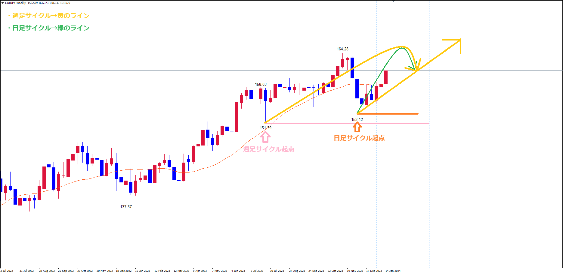 ・今回の日足サイクルが164.28以下で天井を付ける場合、オレンジのラインが起点の週足サイクル