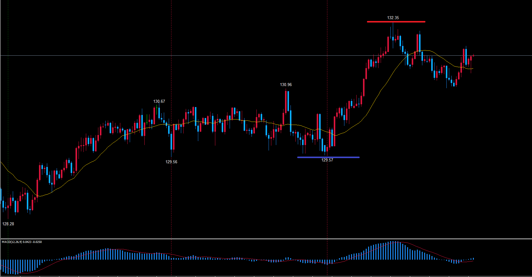 ユーロ円4時間サイクルは起点129.57から28本目に高値132.35を付けて現在61本目です。