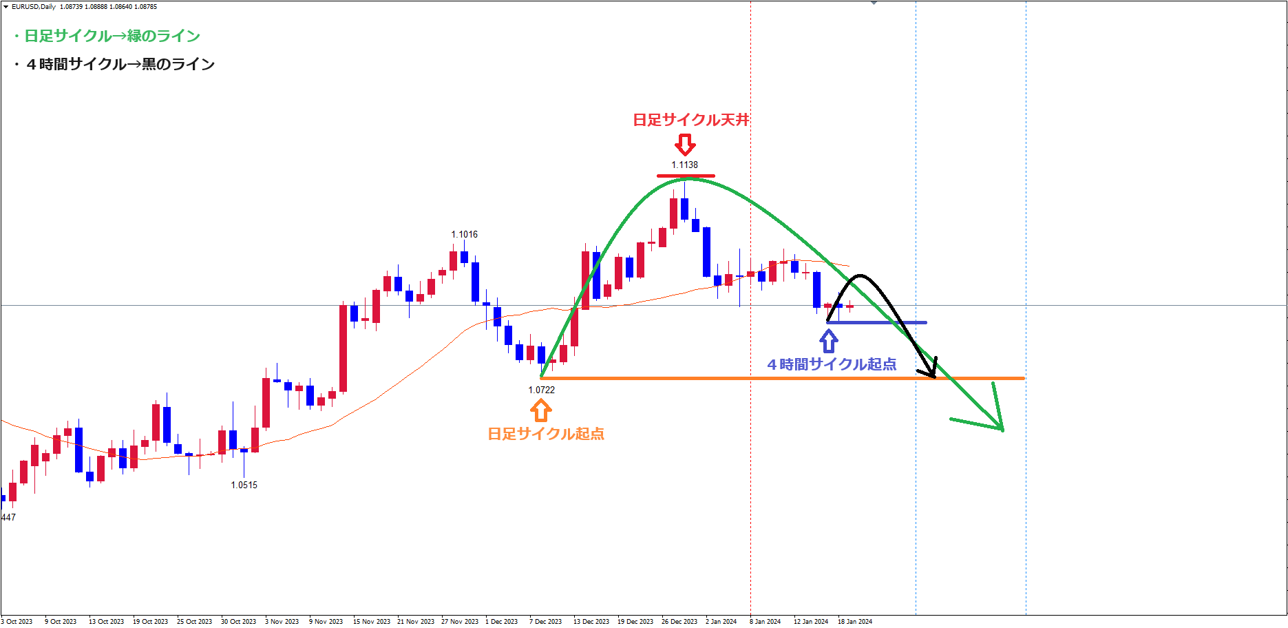 ユーロドルの日足サイクルは、起点オレンジのライン(12/8の安値1.0722)から、現在29本目です。