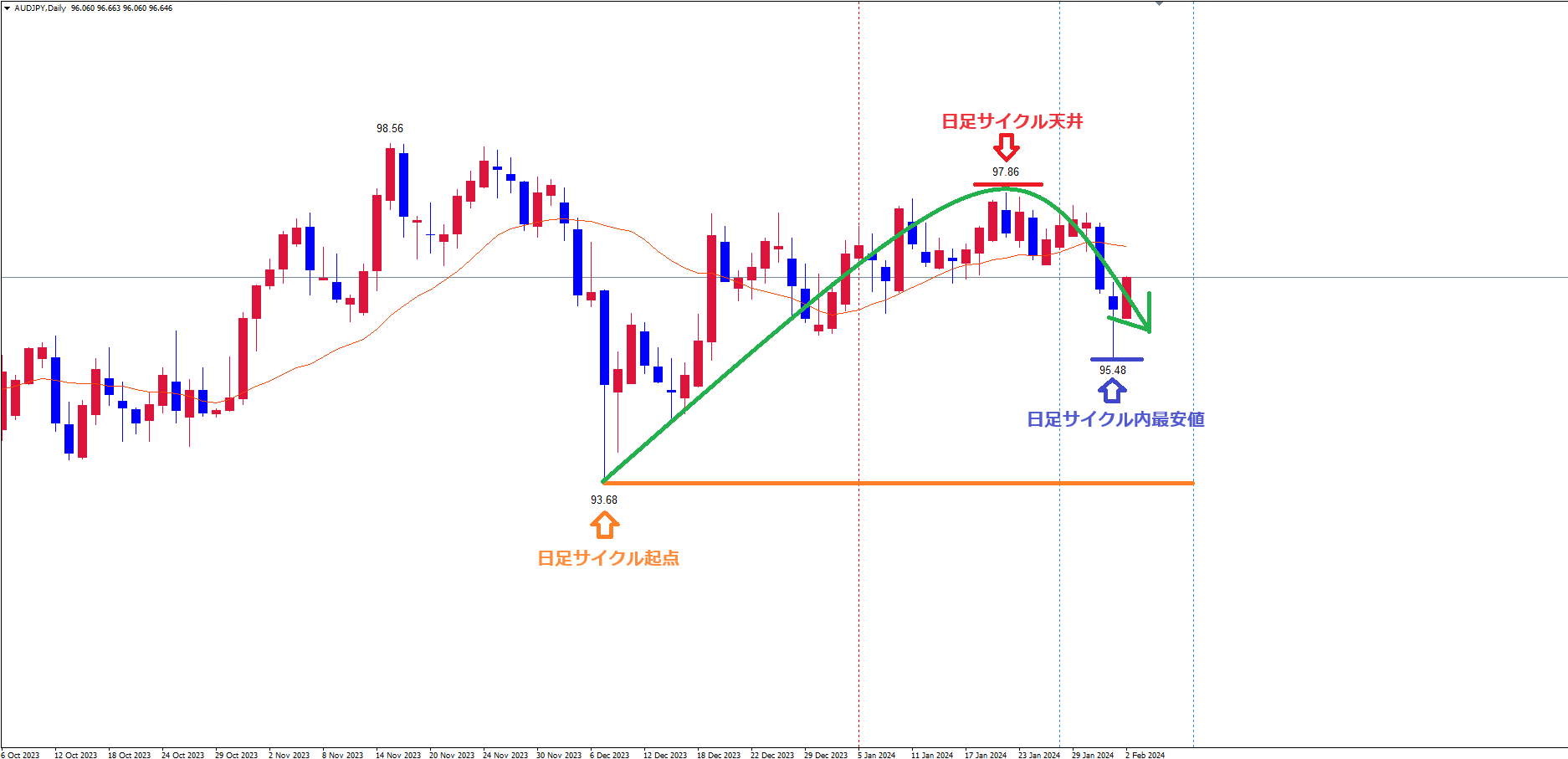 日足サイクルは、起点オレンジのライン(12/7の安値93.68)から現在40本目です。