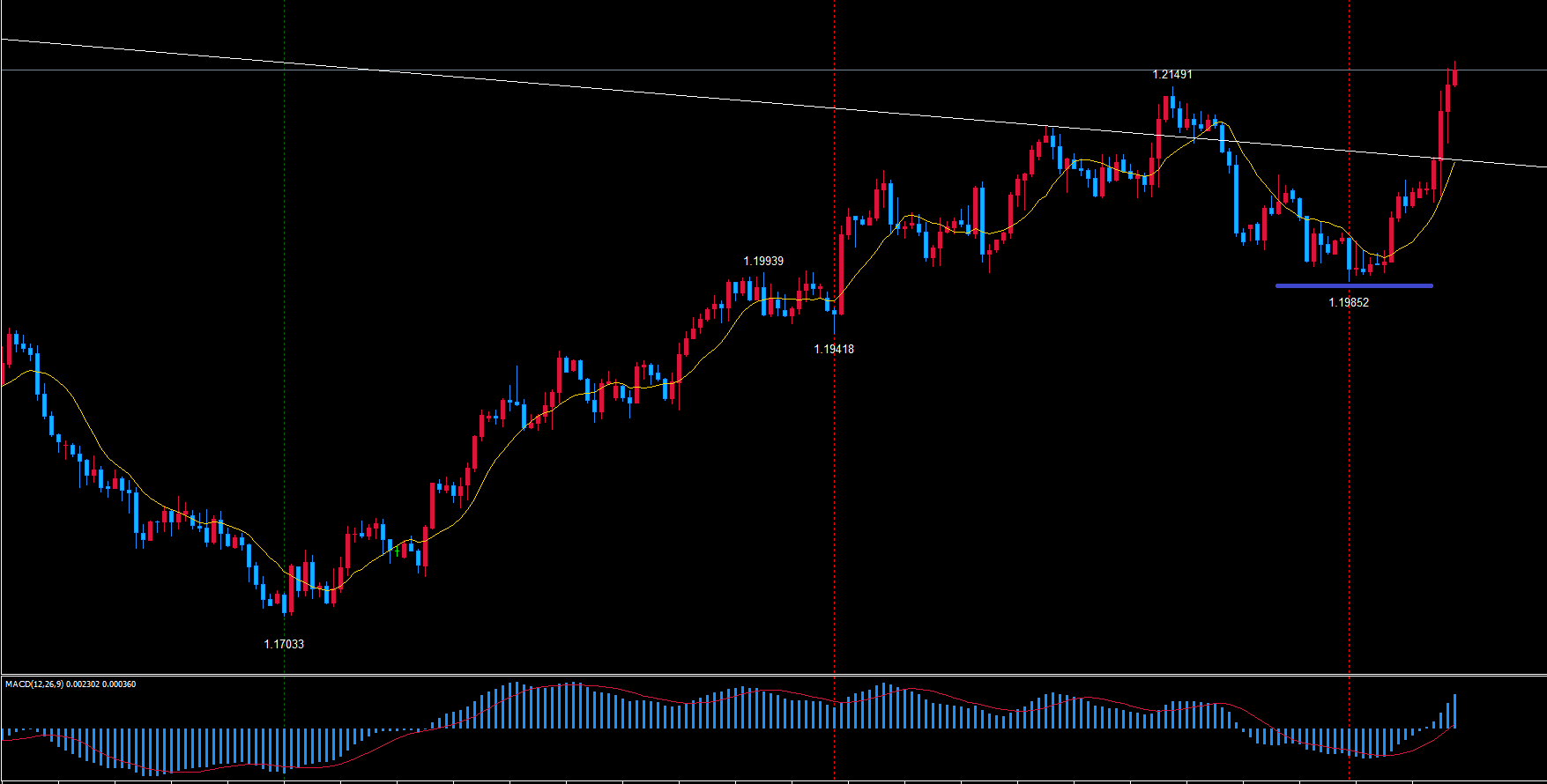 ユーロドル4時間サイクルは昨日のYouTube動画でお伝えしたように1.19852で底を付けて反転と見ています。