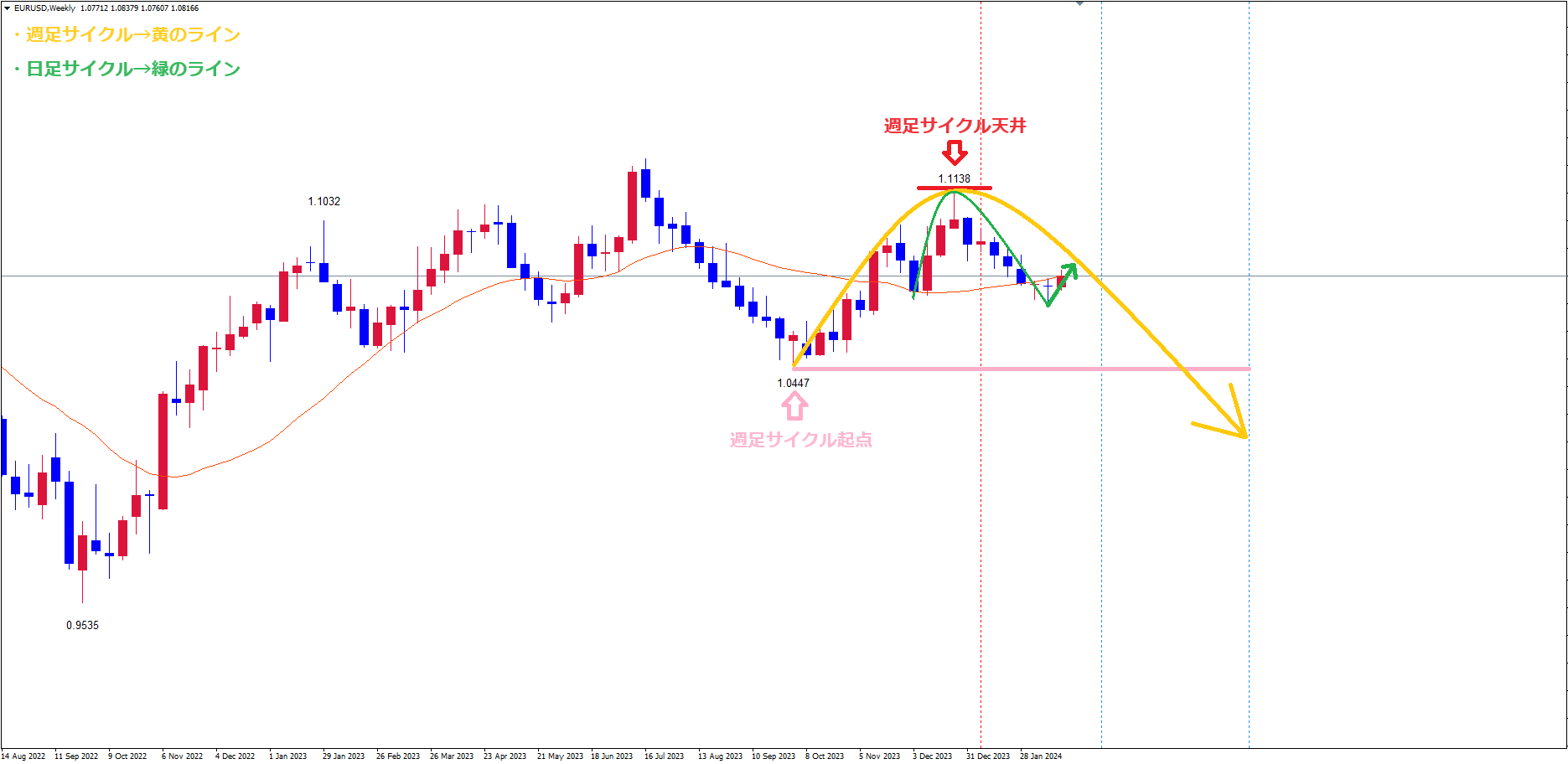 そして、週足サイクルも中央(縦赤のライン)より左側で天井を付けている事から、レフトトランスレーションのサイクルを形成する想定で、