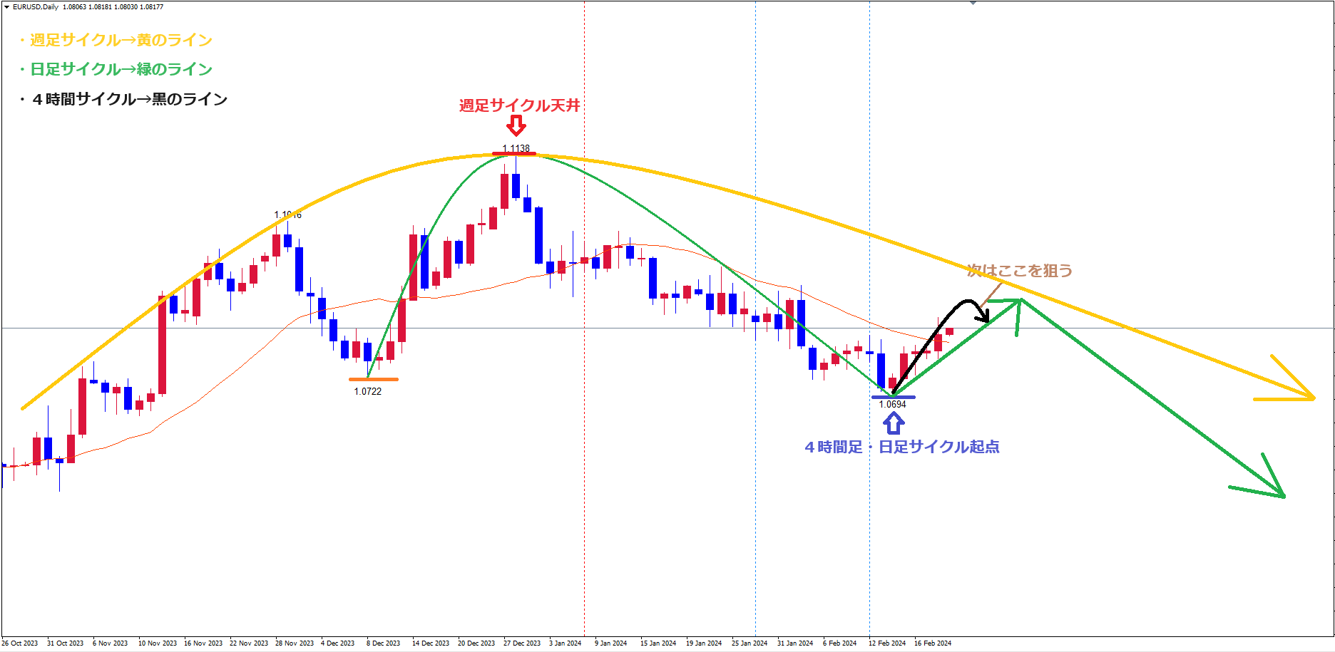 日足サイクルも青のライン(2/14の安値1.0694)で底を付けていると見ています。