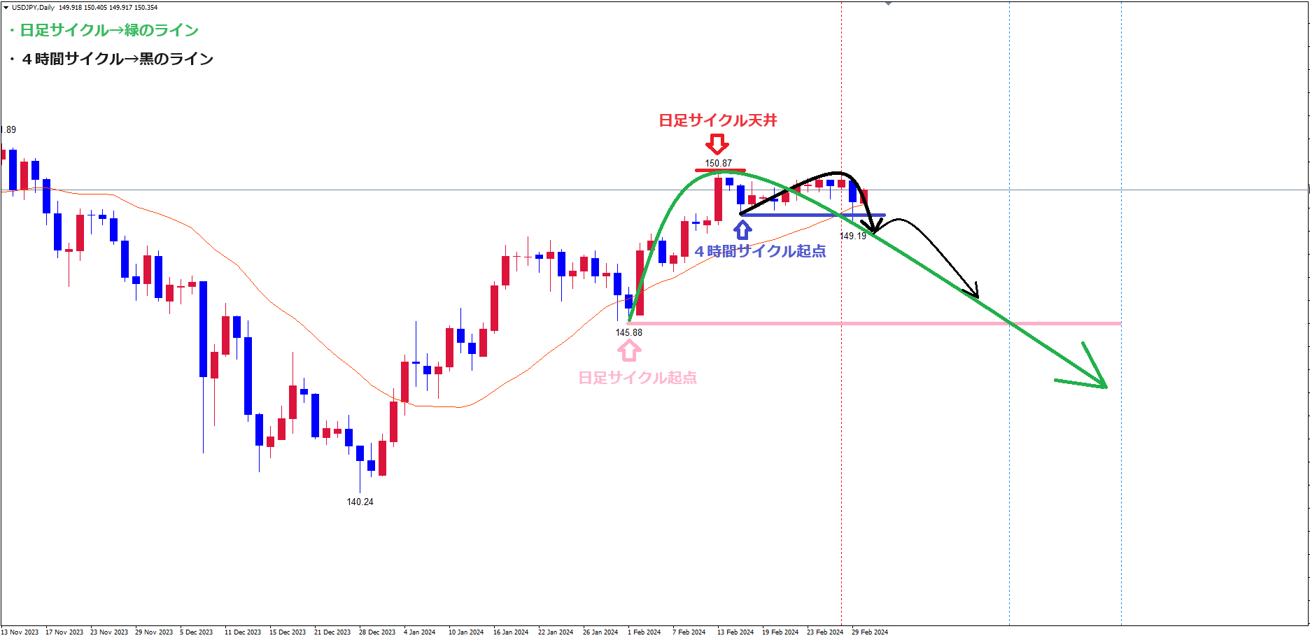 今回はドル円の日足のサイクル的認識とパターン&イメージがどうなるかについて解説していきます。