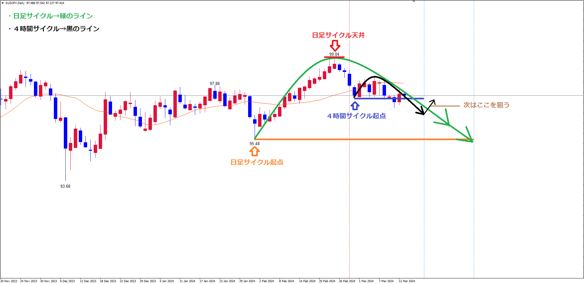 日足サイクルは、起点のオレンジのライン(2/1の安値95.48)から現在31本目の形で見ています。
