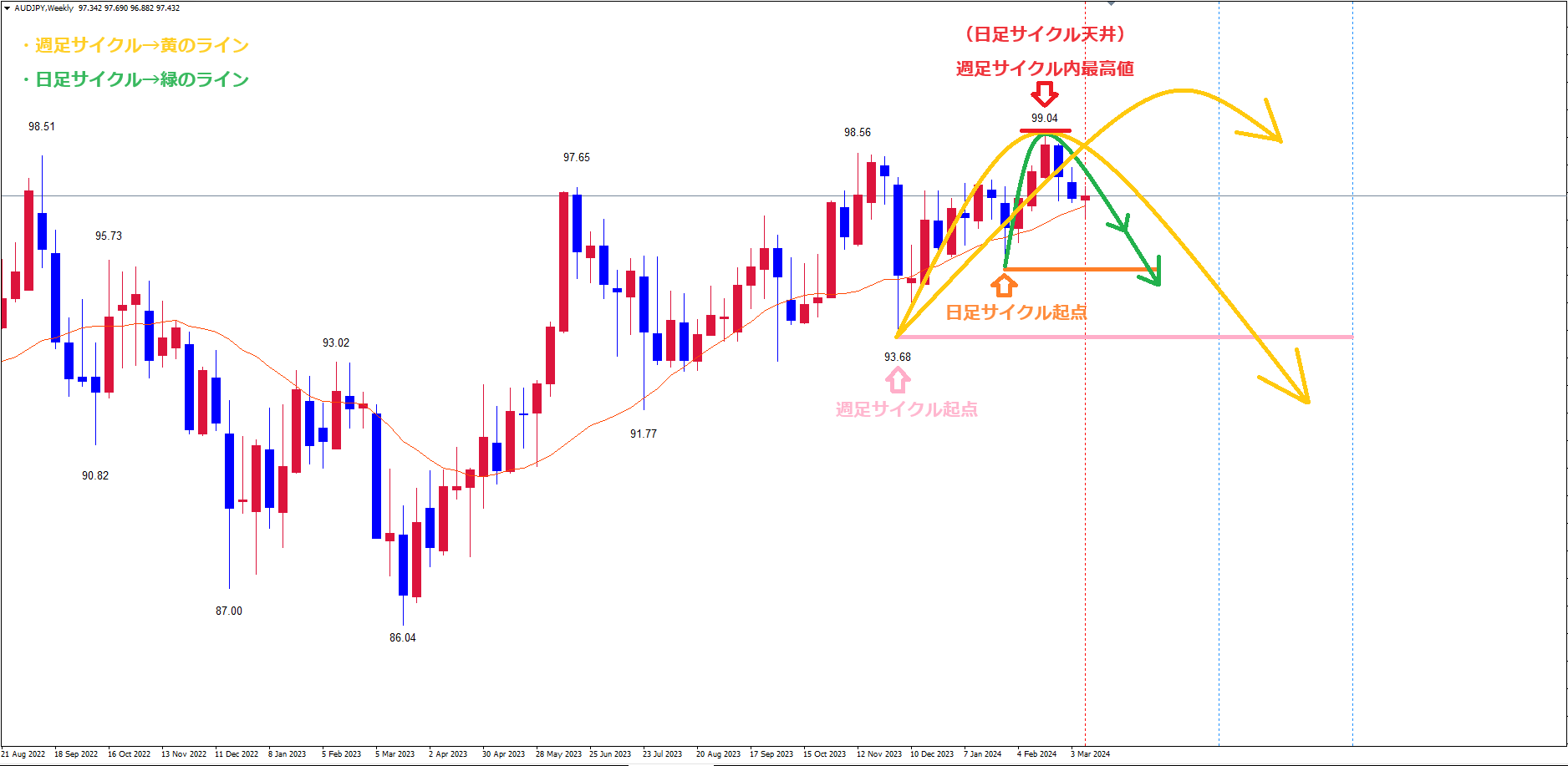 週足サイクルも、直近のサイクル内最高値赤のライン(2/13の高値150.87)で天井を付け、底へ向けて下落の波、方向感:下方向 という認識に切り替えていきます。