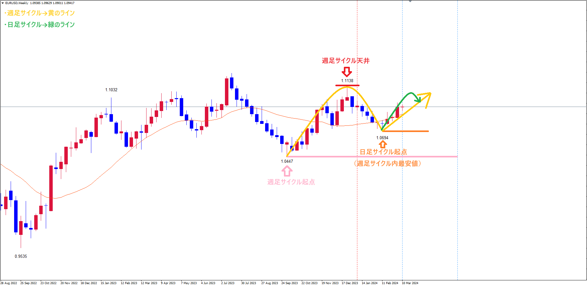 起点オレンジのラインからの週足サイクルは、現在5本目で、