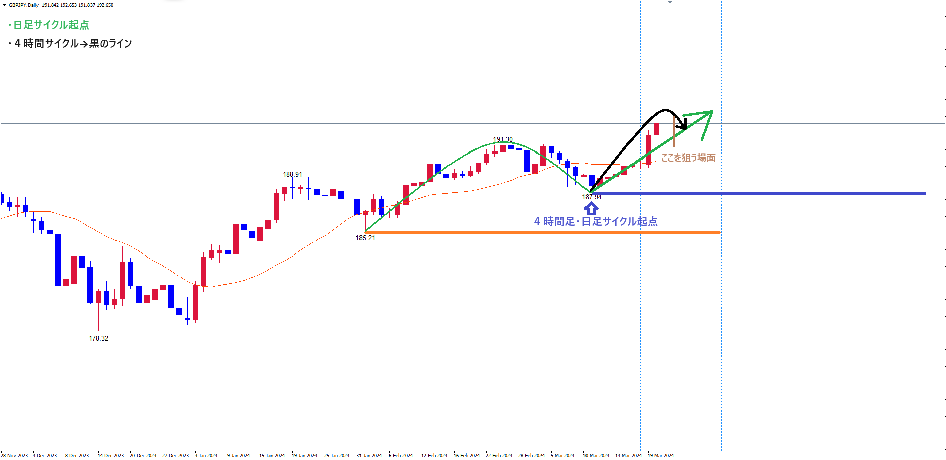 日足・4時間足のサイクル起点と青のライン(3/11の安値187.94)から離れていて、損切り幅が広くなりすぎるので、現状からのロングの優位性は低いです。