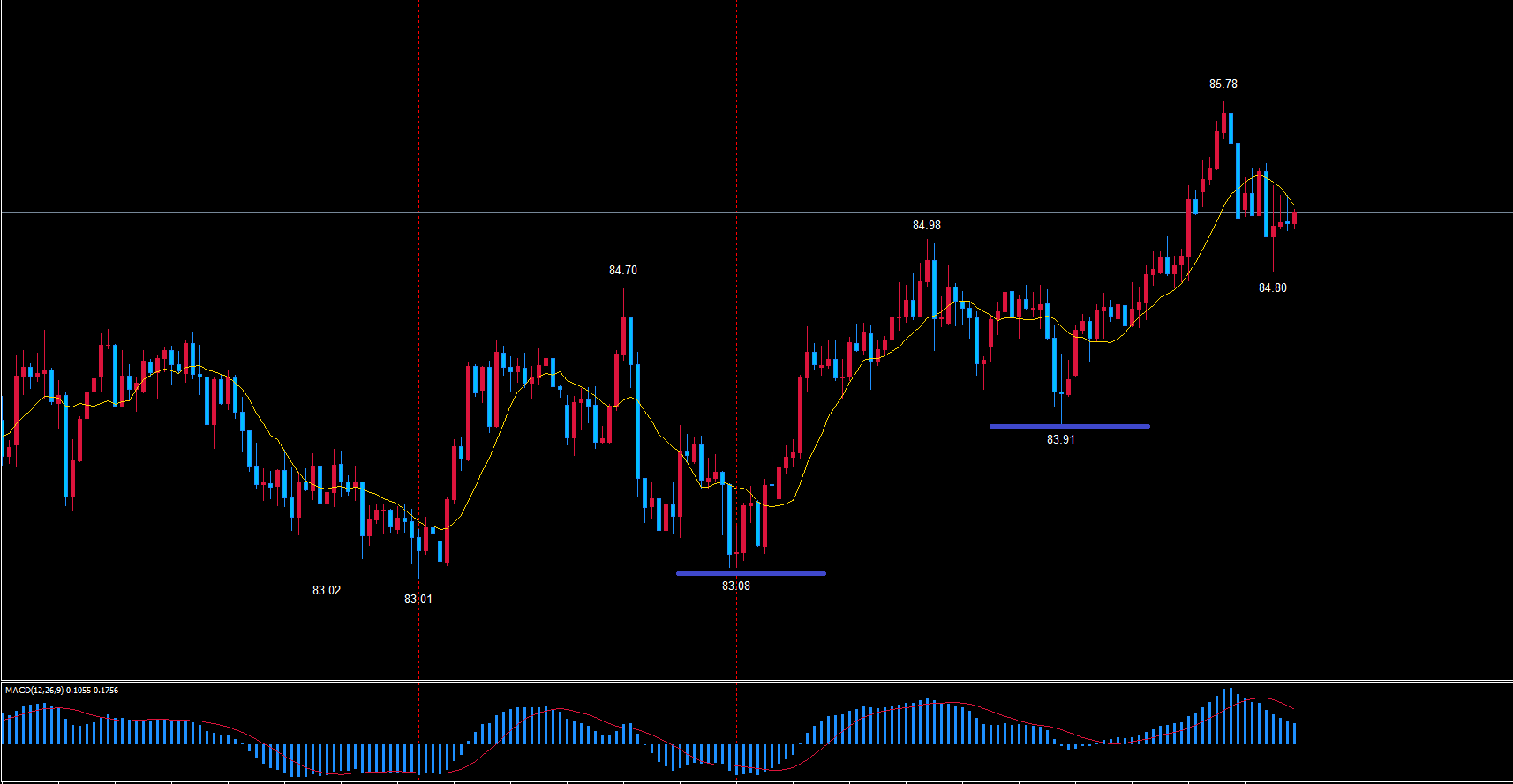 現在で言えば高値85.78を意識して底までのショートを狙うのが良いです。