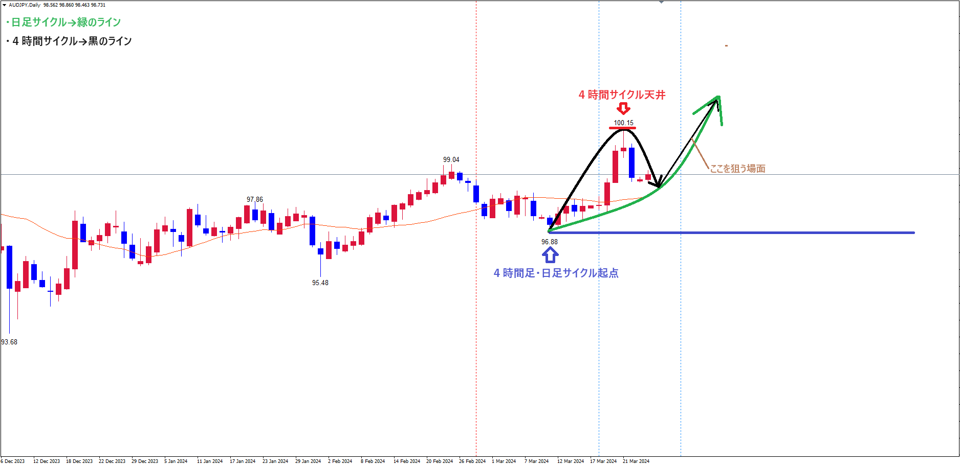 今回4時間サイクル底 = 日足の上昇の波の押し安値 というイメージで、