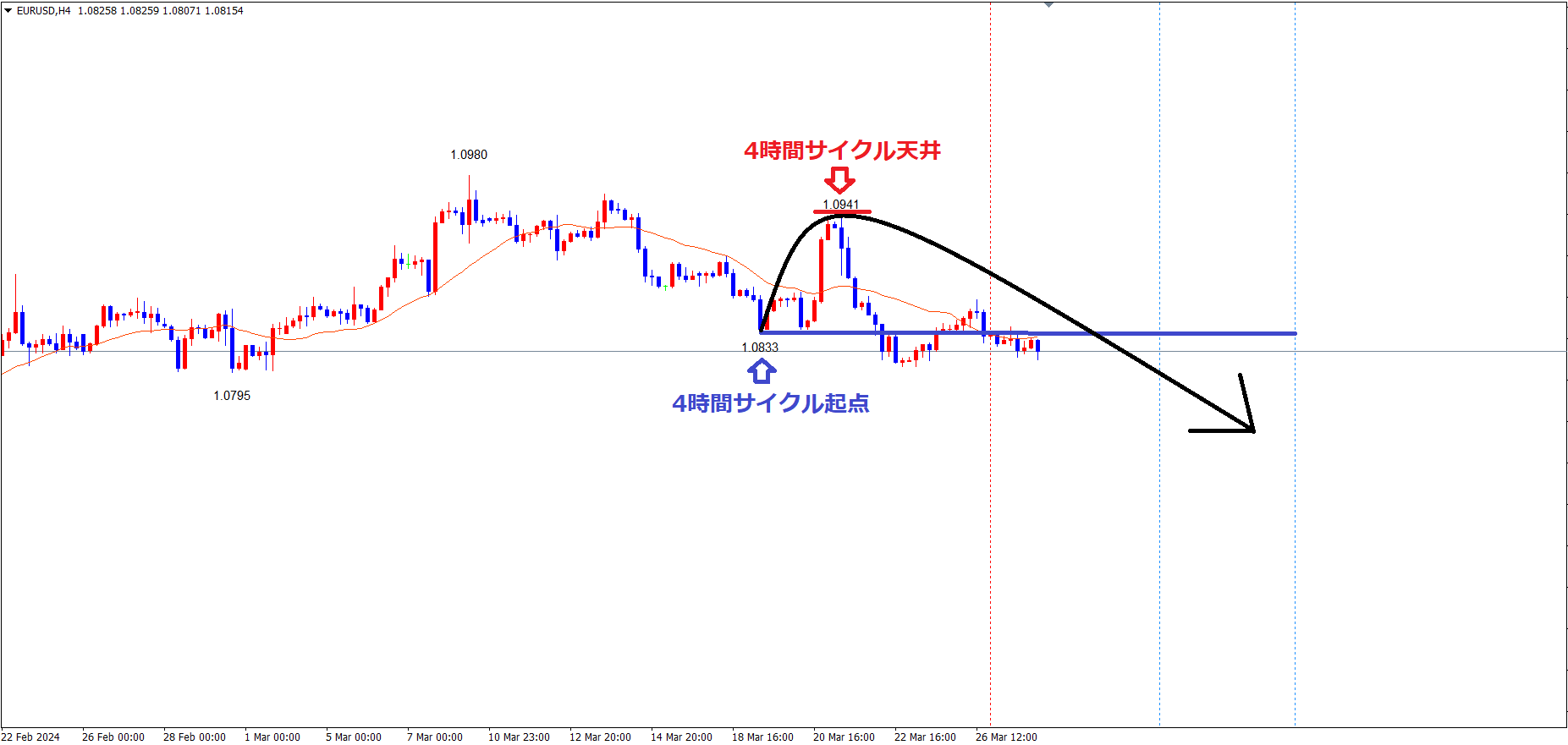 4時間サイクルは、起点青のライン(3/19の安値1.0833)から現在42本目です。