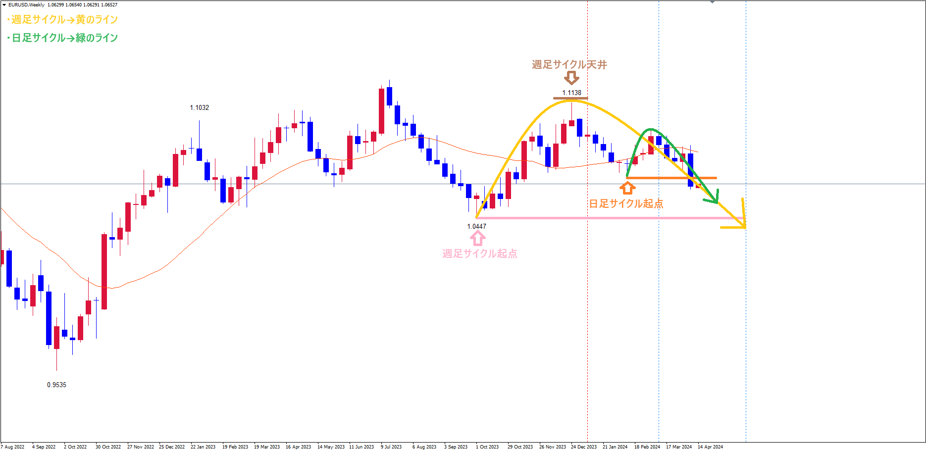 週足サイクルは、起点桃のライン(10/3の安値1.0447)から現在29本目です。