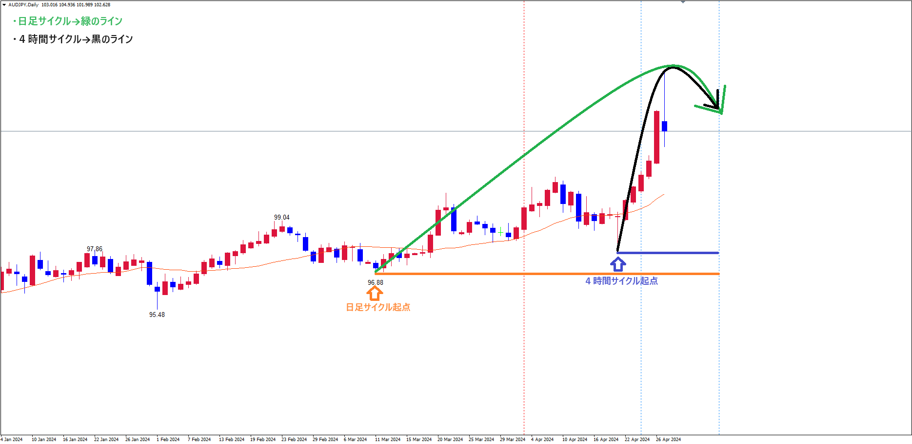 今回の4時間サイクル天井 = 日足サイクル天井 というイメージで見ていきます✅