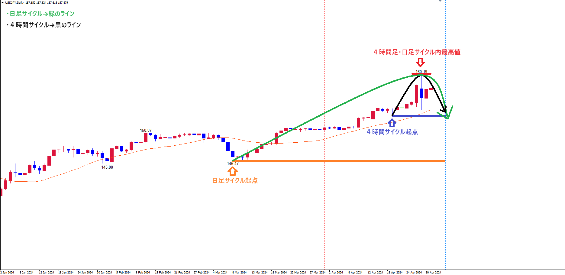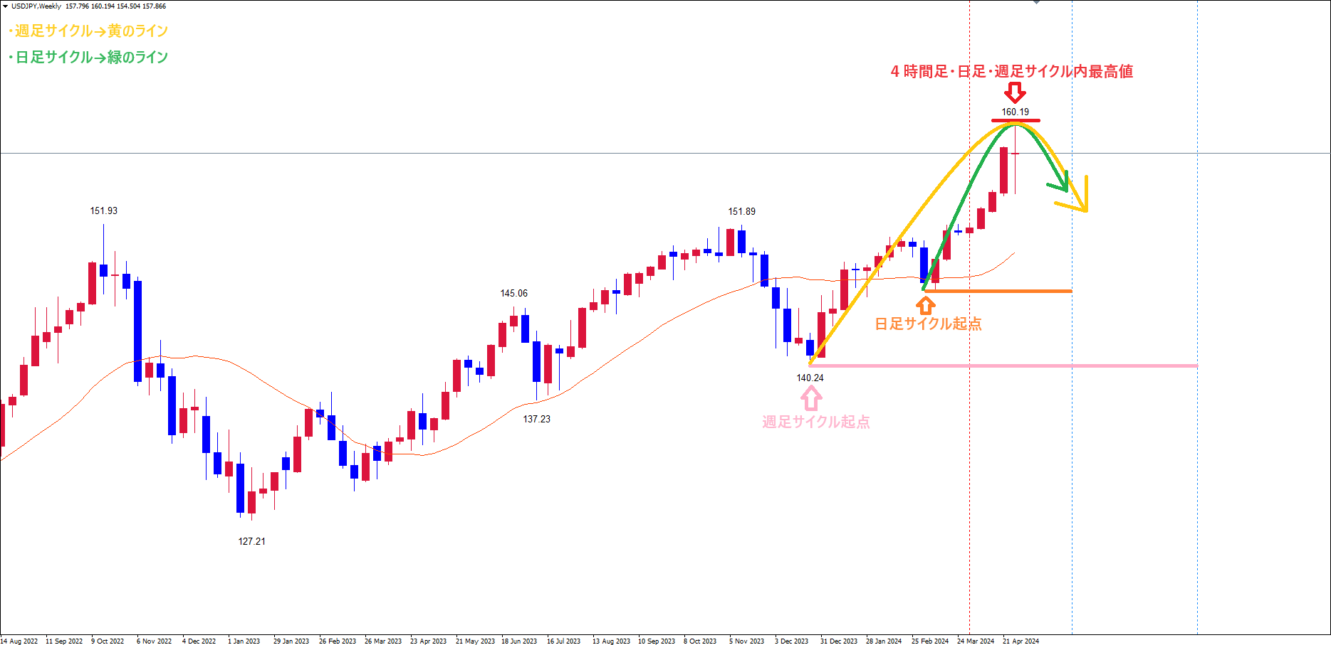 直近のサイクル内最高値赤のライン(4/29の高値160.19)で天井を付けている事を考えておきます。