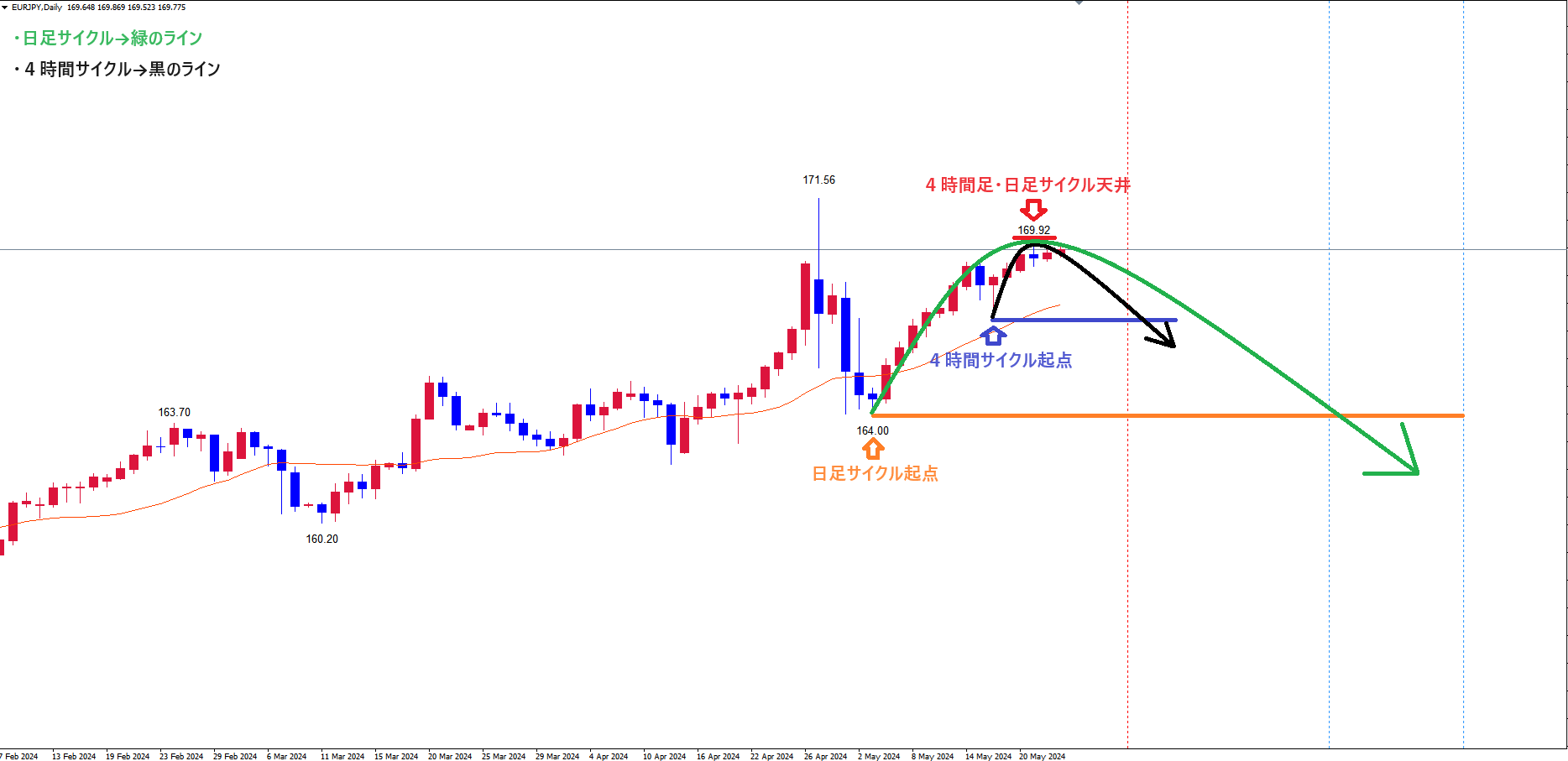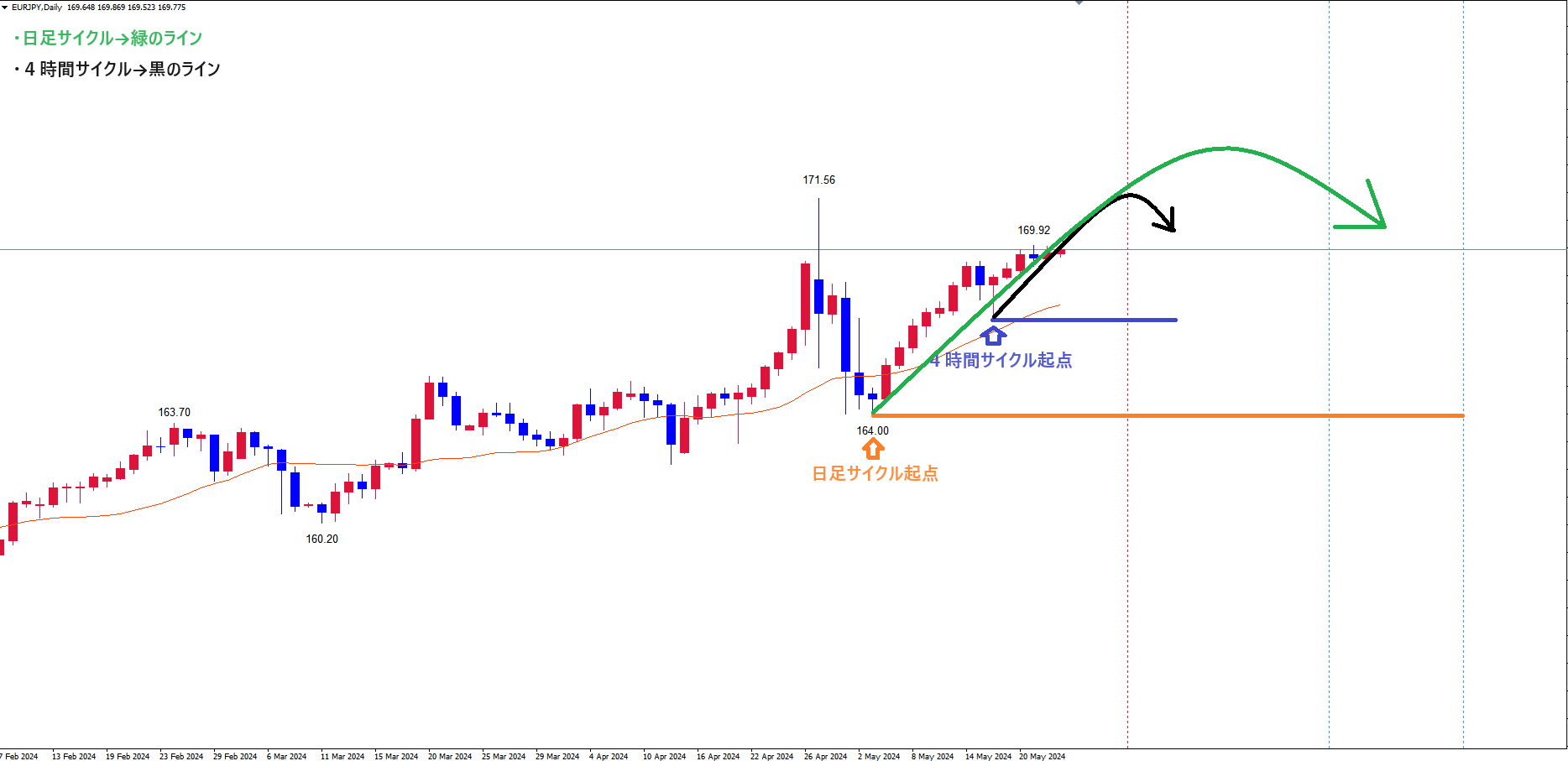 どちらにしても、直近の日足の上昇の波押し安値(4時間サイクル起点青のライン5/16の安値167.31)から離れていて、リスク幅が広くなりすぎるので、