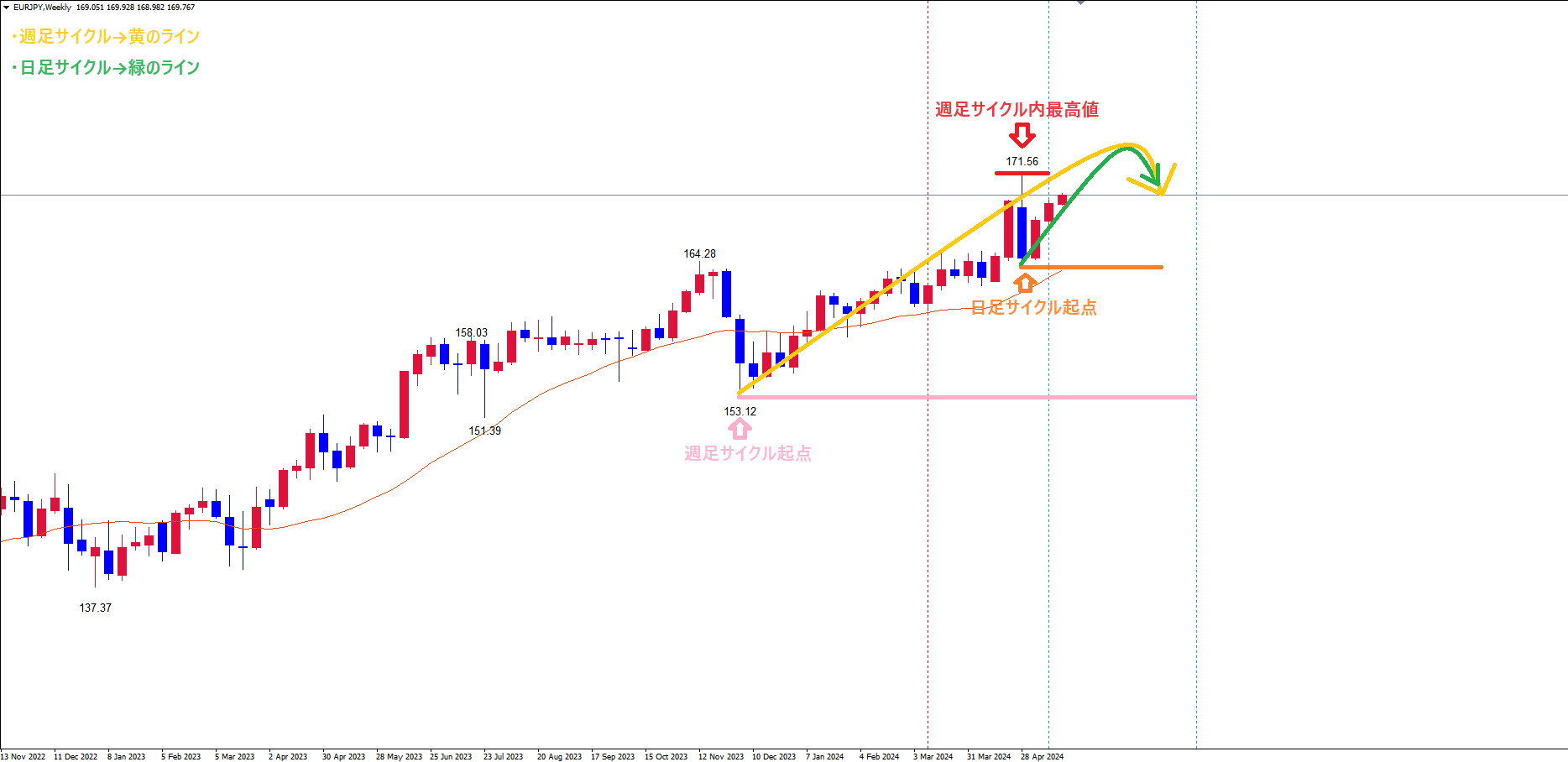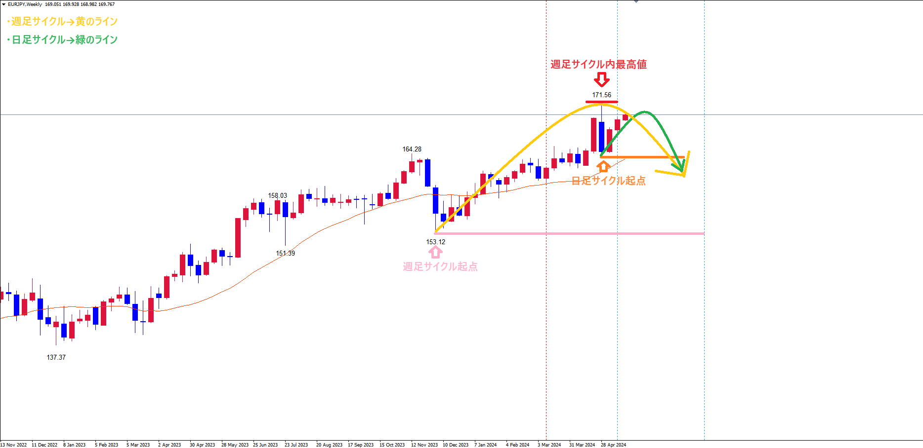週足サイクルは、起点桃のライン(12/7の安値153.12)から現在26本目です。
