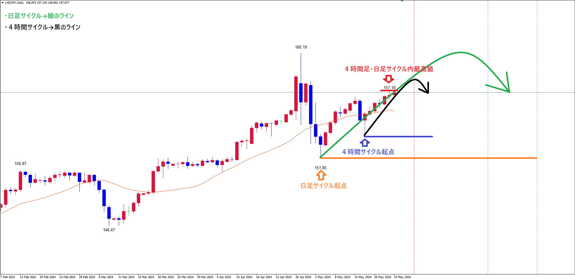 今後4時間サイクル内最高値赤のライン(5/23の高値157.18)を越てくれば、(パターン①)の形で、