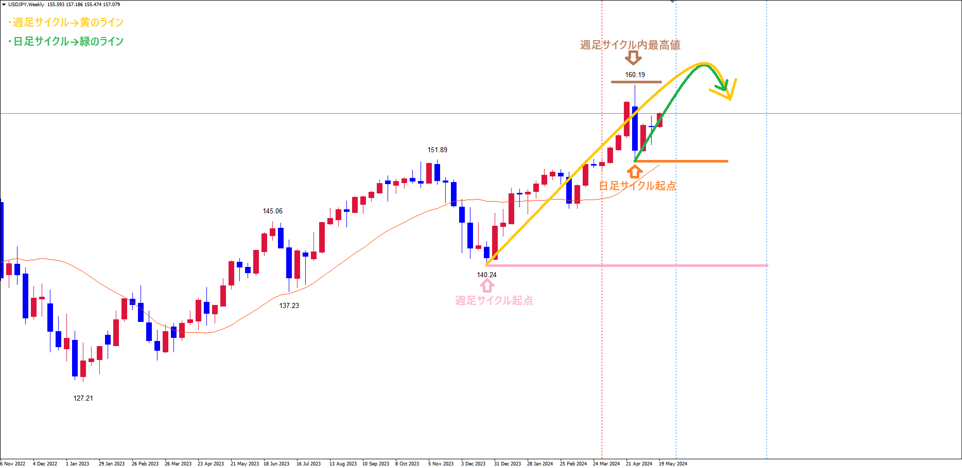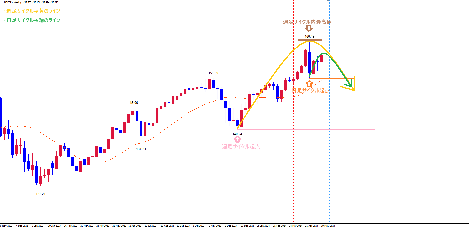 週足サイクルが、茶のライン(4/29の高値160.19)で天井を付け、底へ向けて下落の波、方向感:下方向 に切り替わっており、