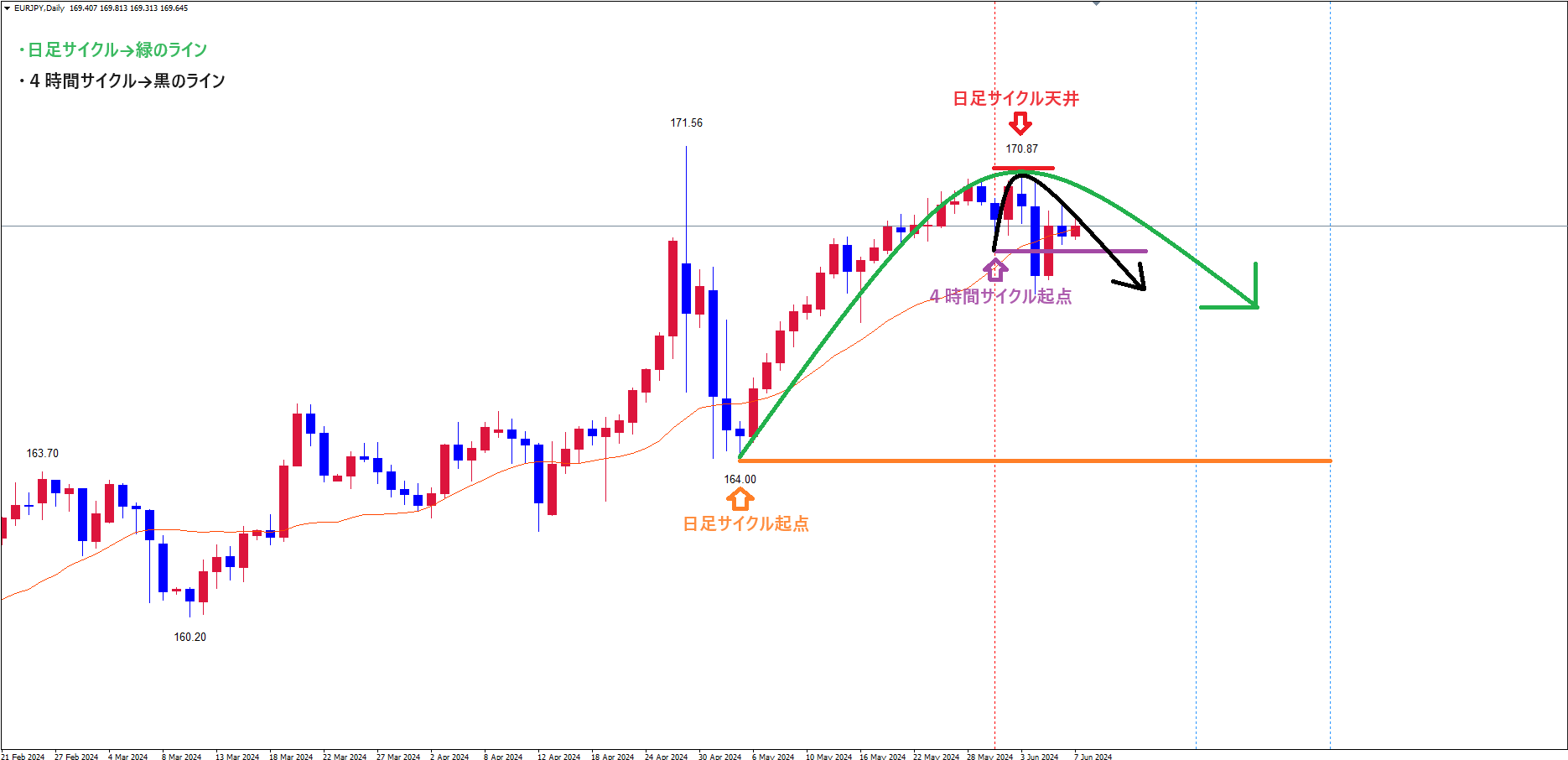 紫のライン(5/30の安値169.05)が起点の4時間サイクルが、レフトトランスレーションのサイクル(日足レベルで、高値切り下げ、安値更新の動き)を付ける形を形成し、