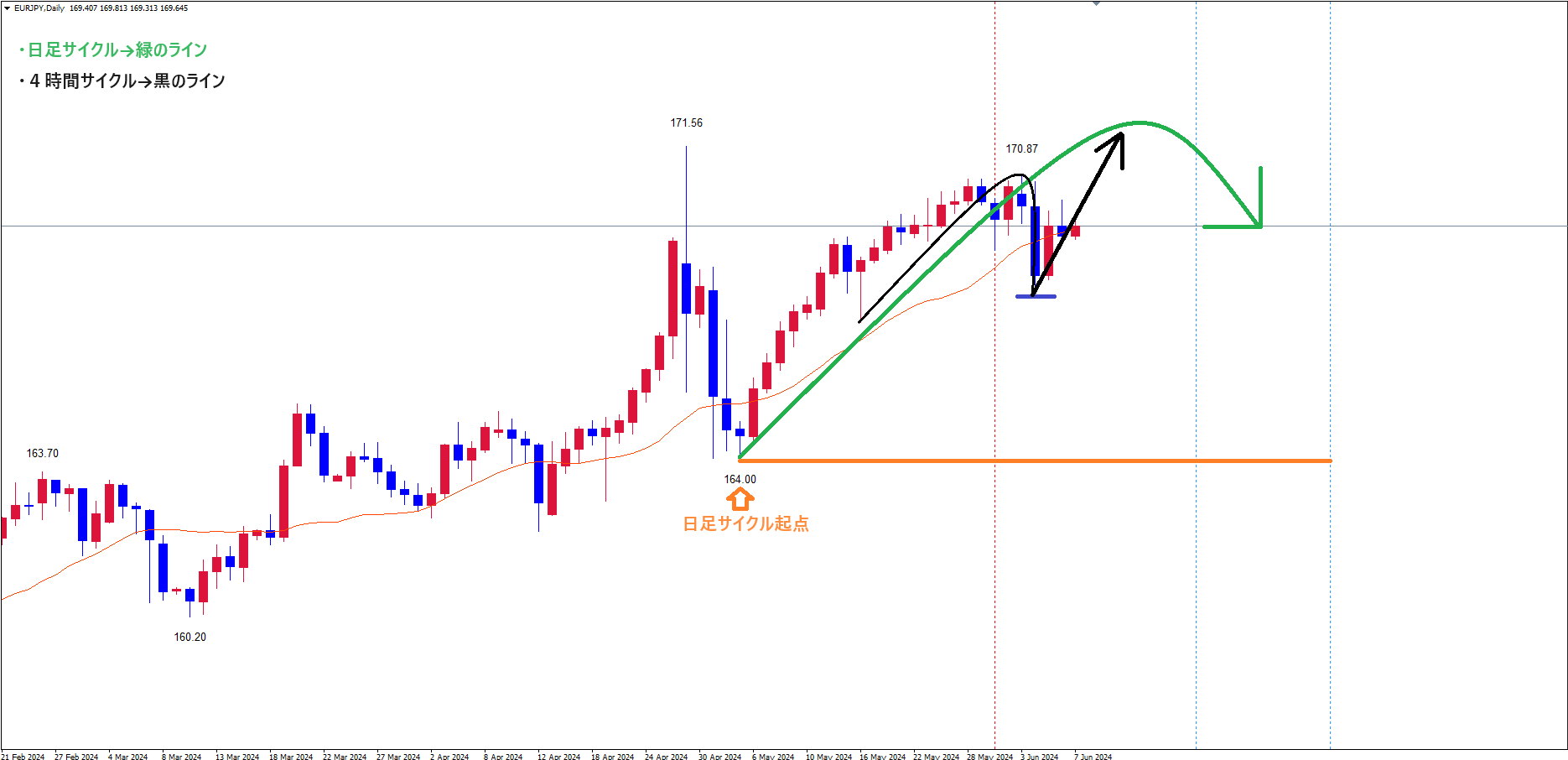 日足サイクルは、赤のライン(5/29の高値170.87)で天井を付け、サイクル底へ向けて下落の波、方向感:下方向 に切り替わっている認識で、