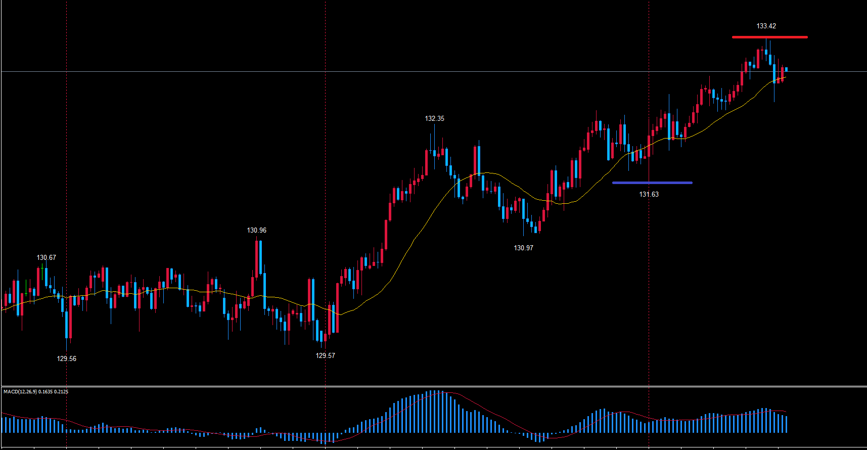 その中で現状の立ち回りとしてはレフトトランスレーション想定に絞って現在の高値133.42から底までのショートで考えています。