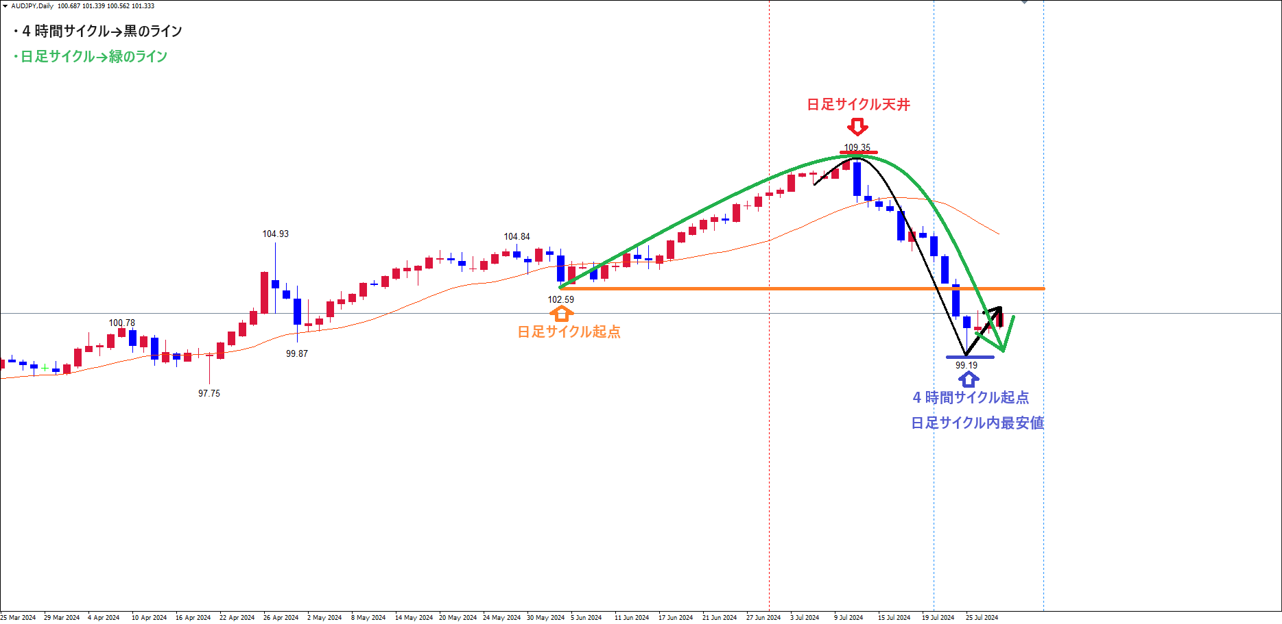 直近の日足サイクル内最安値青のライン(7/25の安値99.19)で、日足サイクルも底を付けている可能性もありますが、