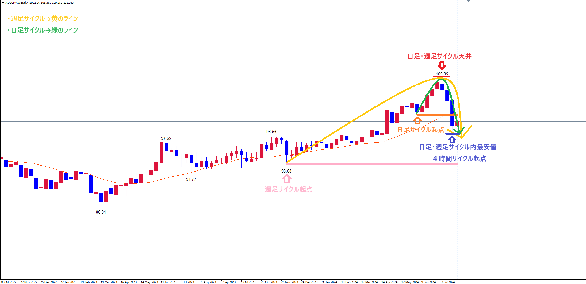 週足サイクルも、赤のライン(7/11の高値109.35)で天井を付け、サイクル底へ向けて下落の波、方向感:下方向 という認識で、