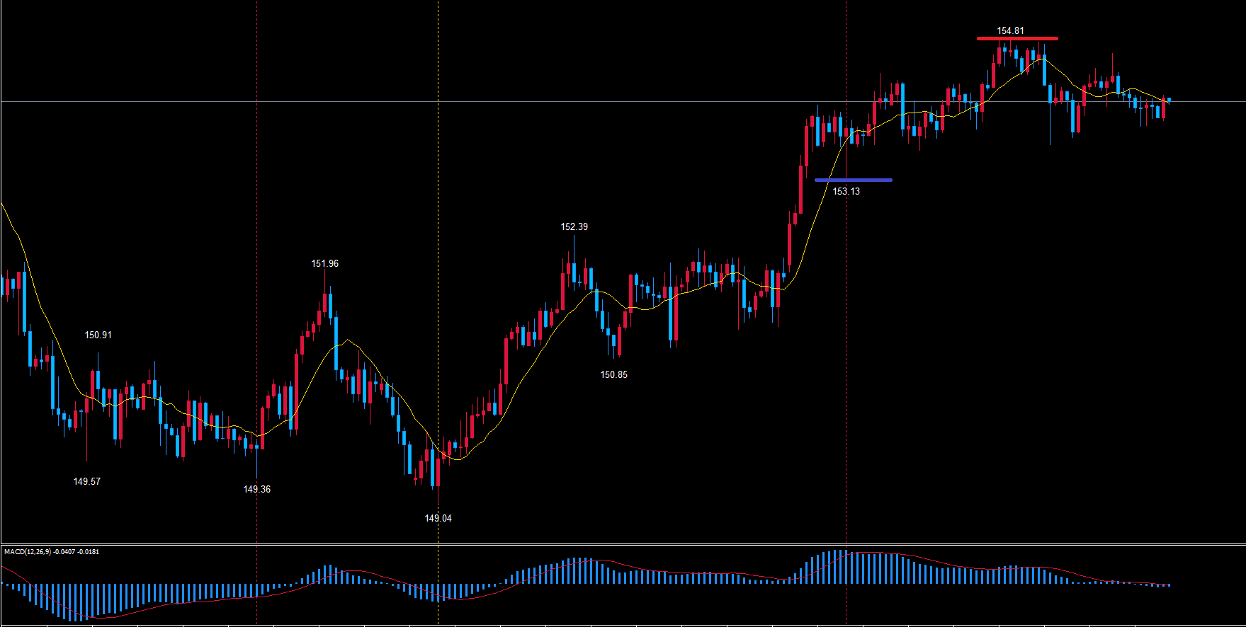 上昇する場合は高値154.81を越えるかどうかに注目していきます。