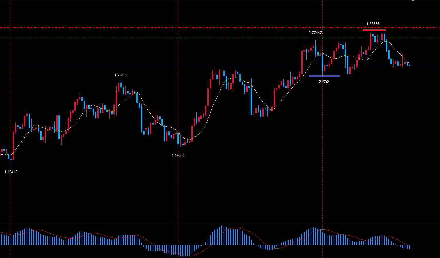 ユーロドル4時間サイクルは起点1.21592から38本目です。