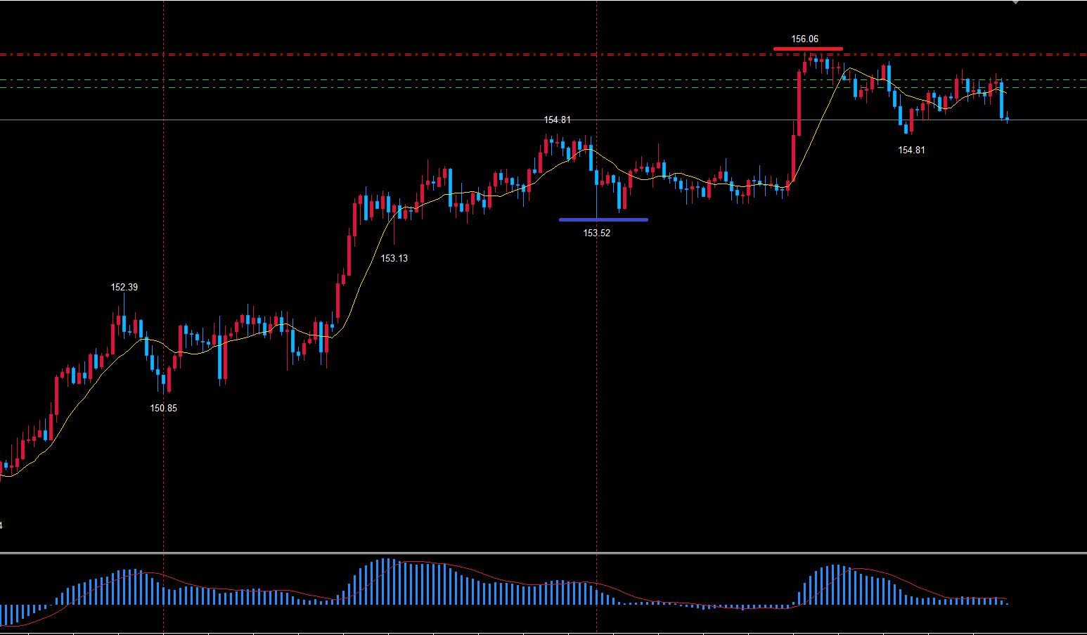 現在で言えば57本目に付けている154.81ですが、57本目という事は底時間は60本からと考えると底を付けるには少し早い状況です。
