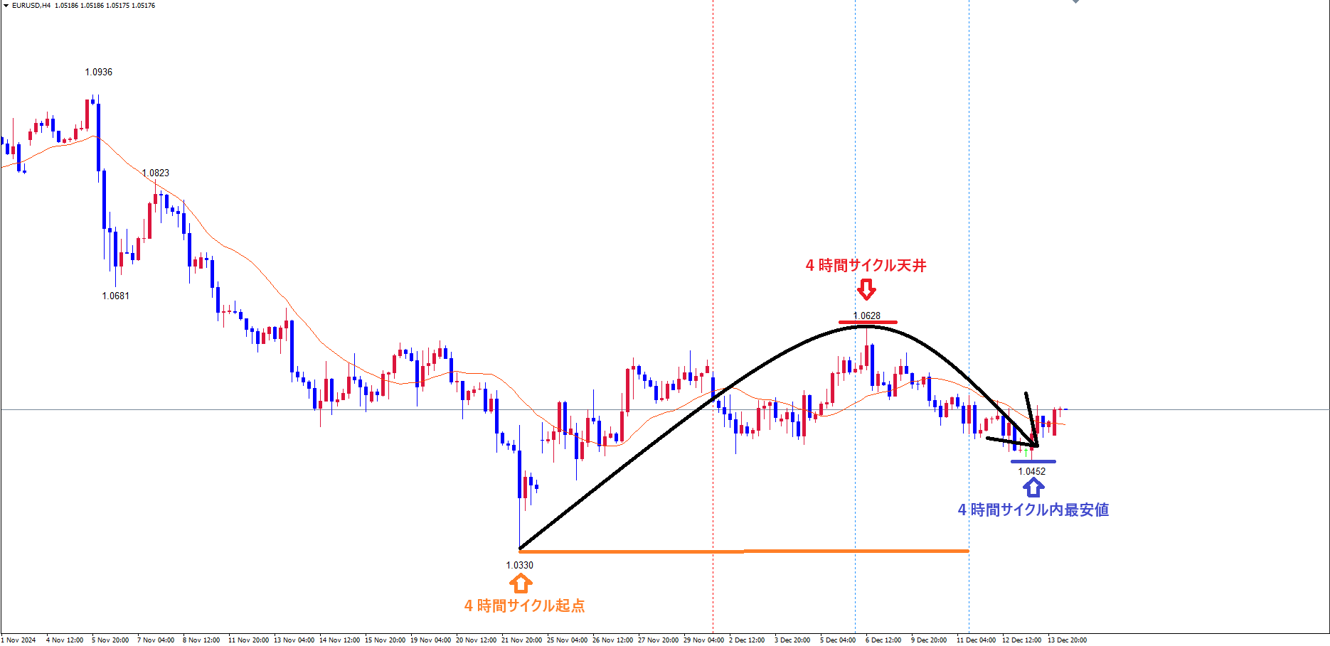 4時間サイクルは、起点オレンジのライン(11/22の安値1.0330)から、現在96本目です✅