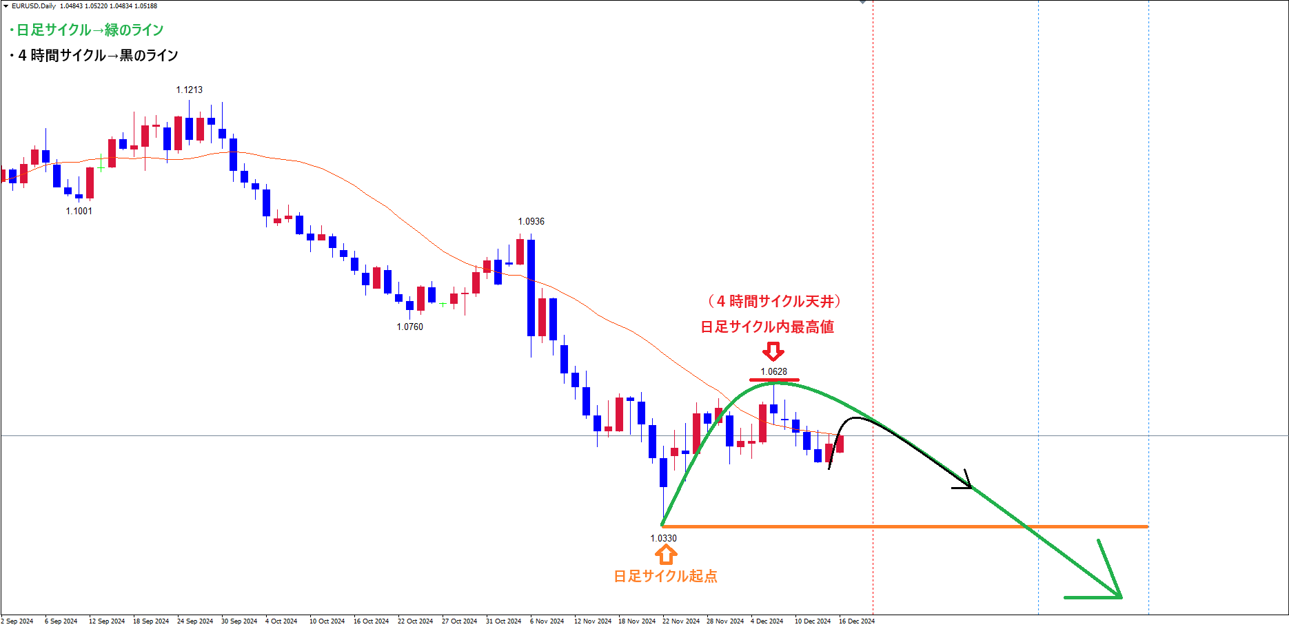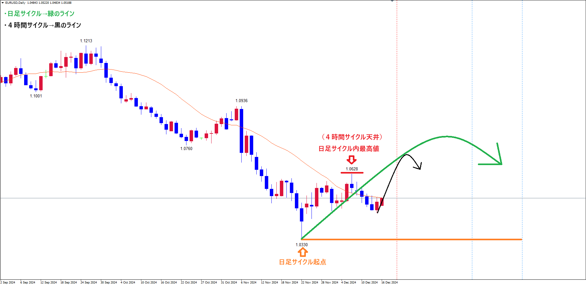 そして、直近のサイクル内最安値青のライン(12/13の安値1.0452)で、サイクル底を付けている可能性も考えて、上昇に注意しておきます✅