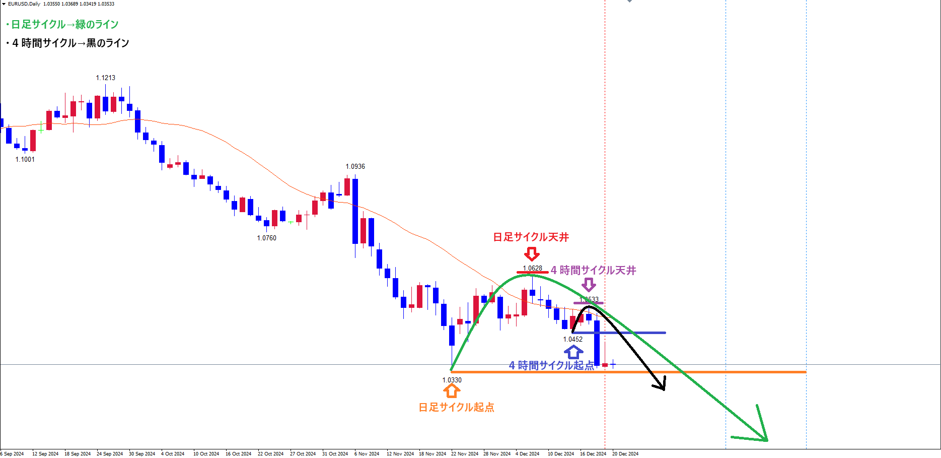 今後は、起点オレンジのライン(11/22の安値1.0330)以下の底の時間帯・本数まで下落の波が継続する想定です✅
