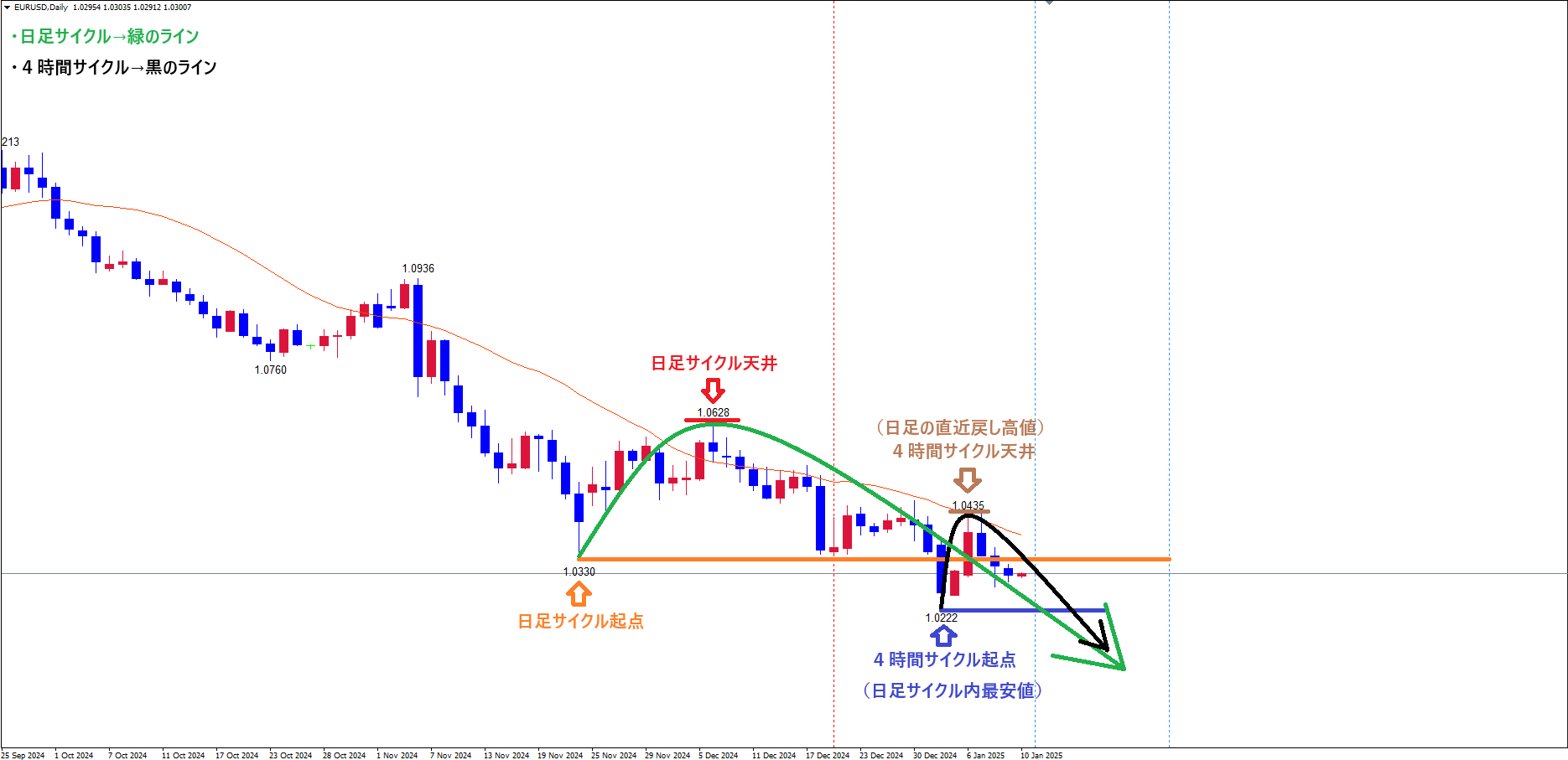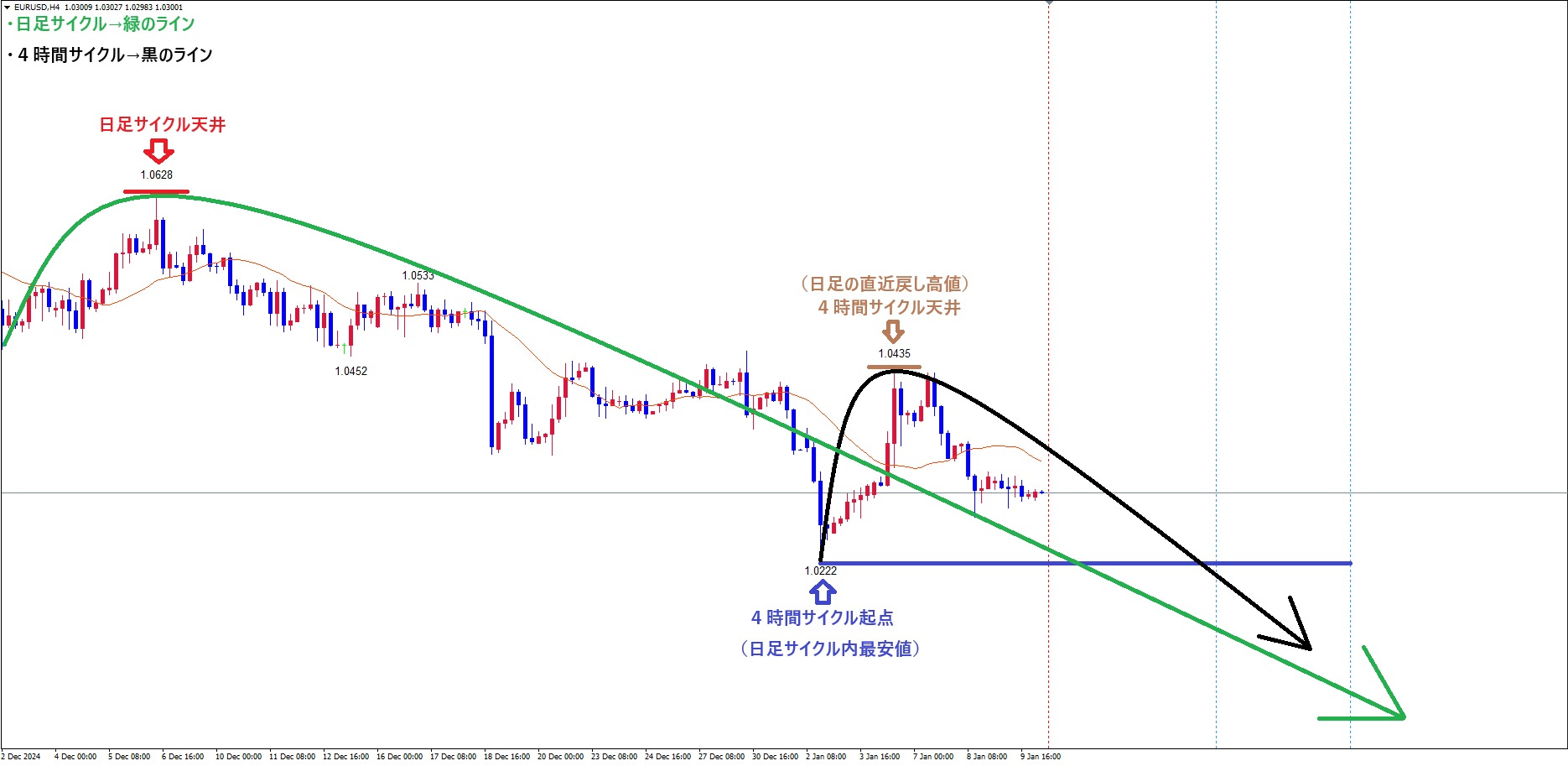 現在は、赤のライン(12/6の高値1.0628)で天井を付け、サイクル底へ向けて下落の波、方向感:下方向 という認識です✅