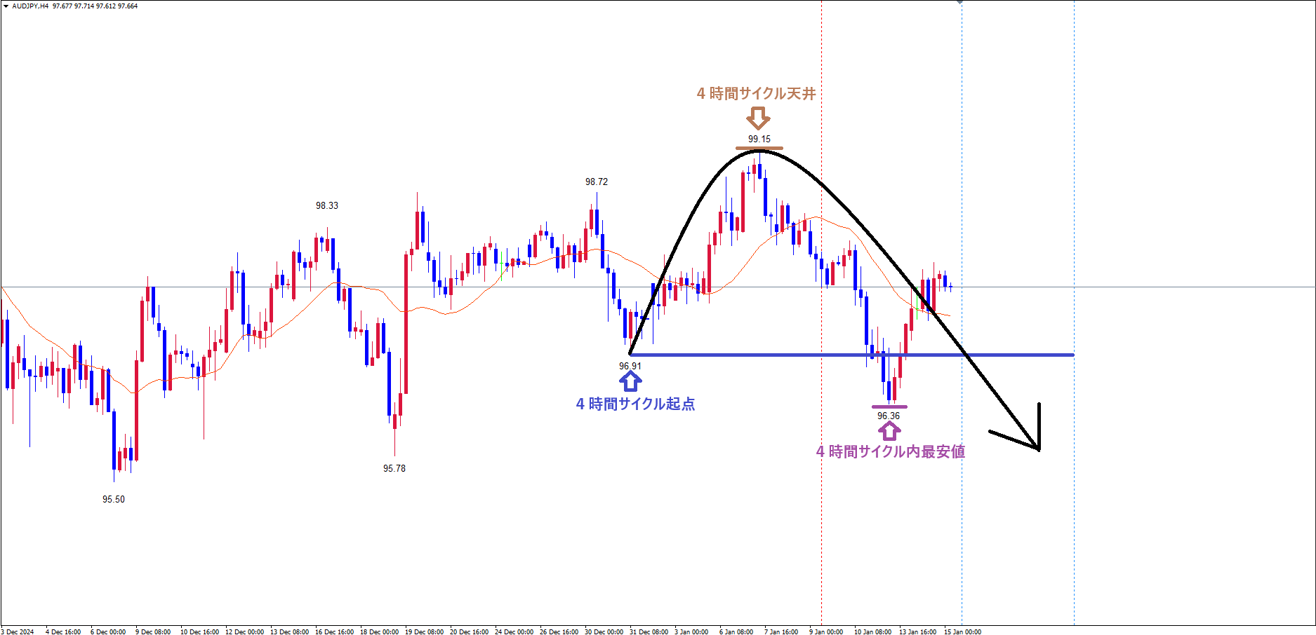 どちらにしても、起点紫のライン(1/13の安値96.36)からの4時間サイクルも、レフトトランスレーション(下落トレンド)のサイクルを形成するイメージです✅