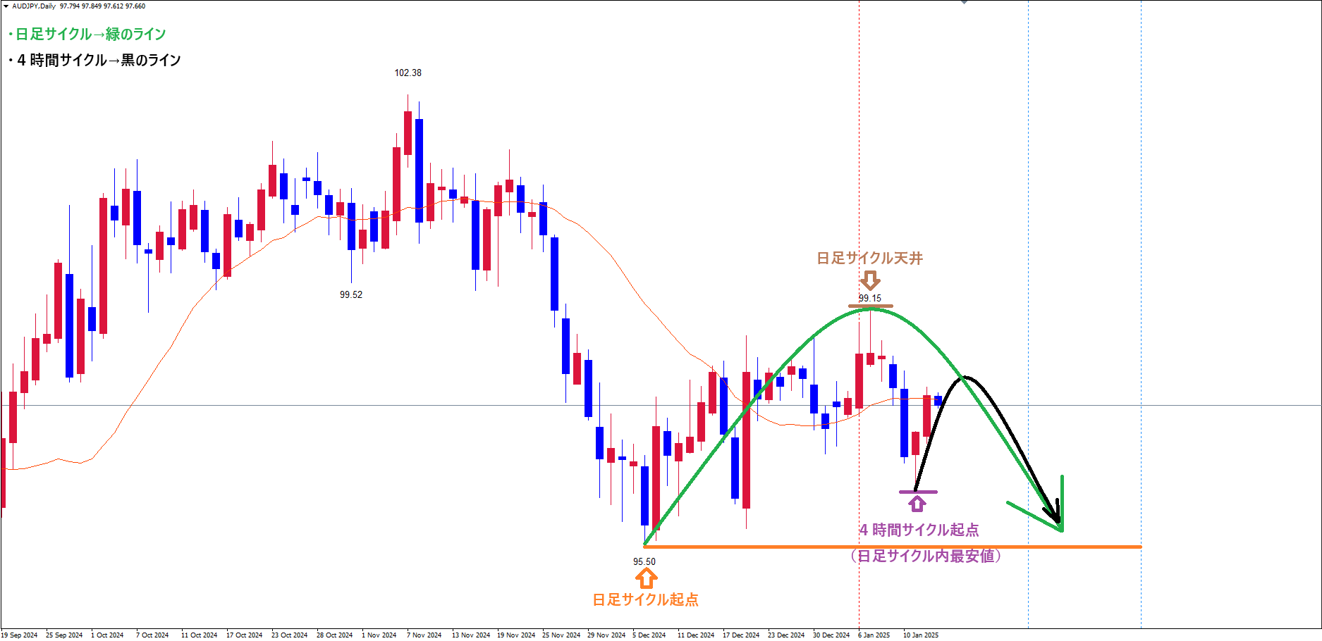 紫のライン(1/13の安値96.36)からの4時間サイクルは、日足も確認してから解説します。