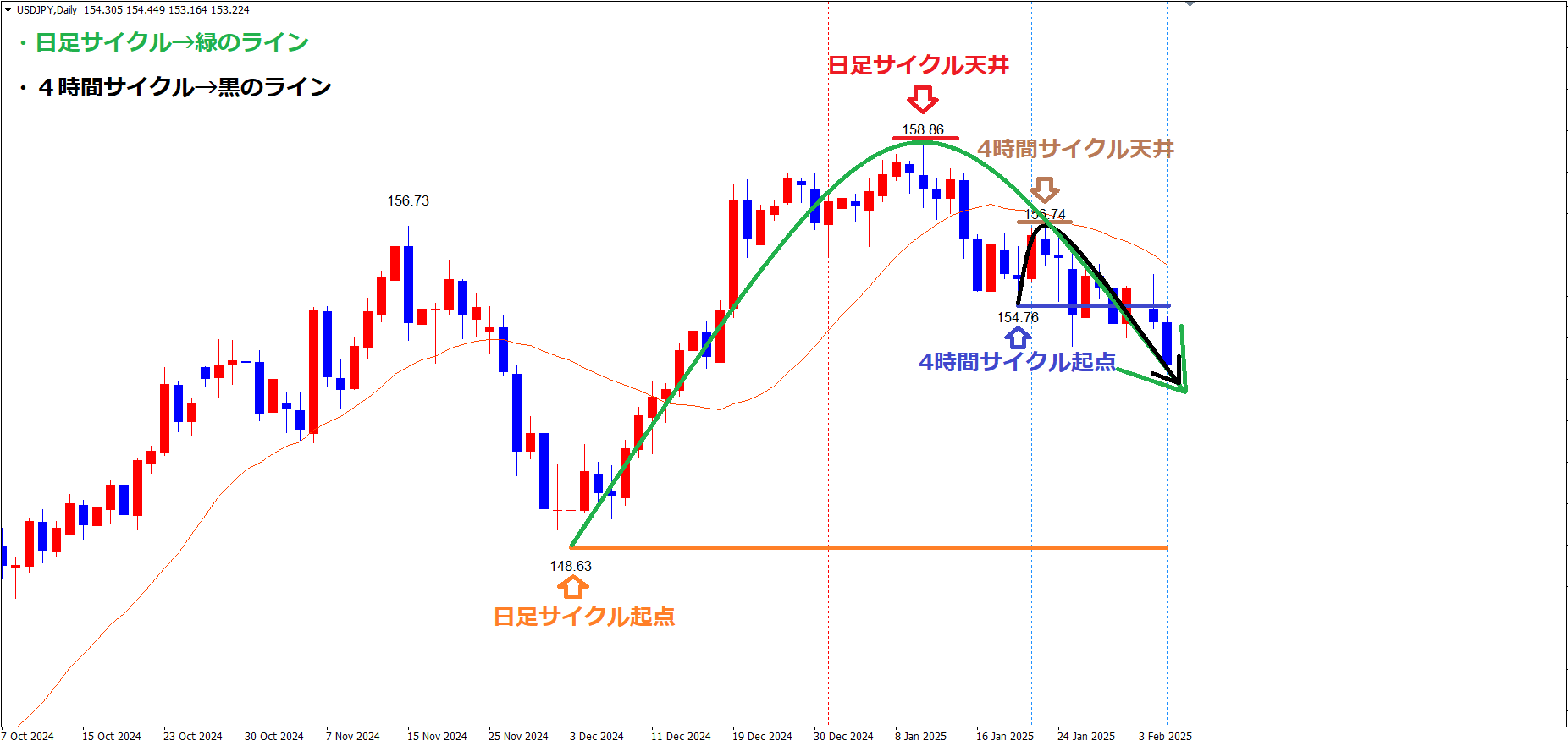既に起点青のライン(1/21の安値154.76)割れている事で、レフトトランスレーション(下落トレンド)のサイクルという事が理論的に確定し、