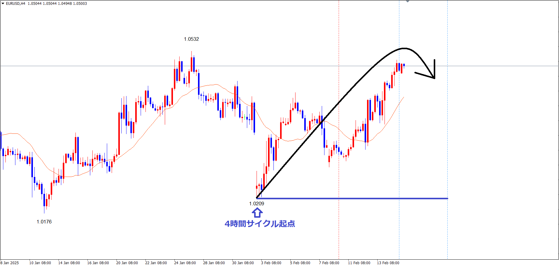 4時間サイクルは、起点青のライン(2/3の安値1.0209)から、現在62本目です✅
