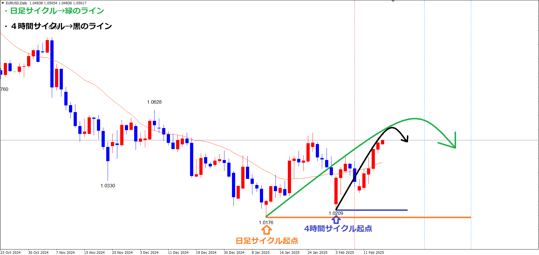 今回の日足サイクルも、ライトトランスレーション(上昇トレンド)のサイクルを形成する想定で、