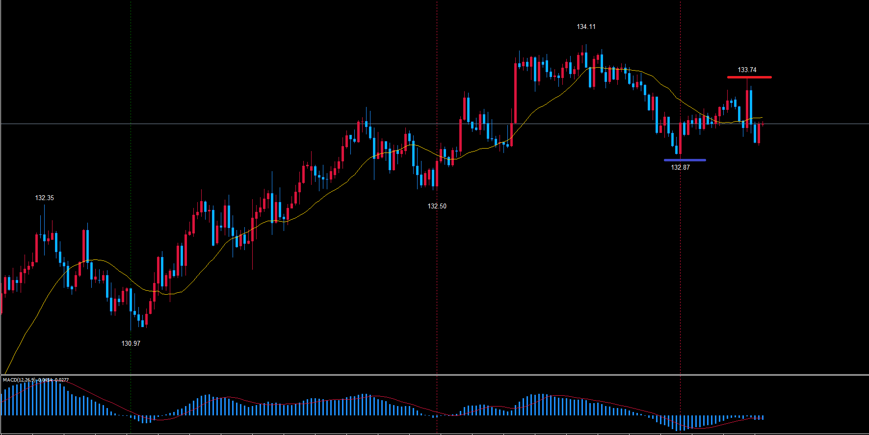 ただ、高値の赤のライン133.74を付けて現在は起点の青のライン付近まで下落してきている状況です。
