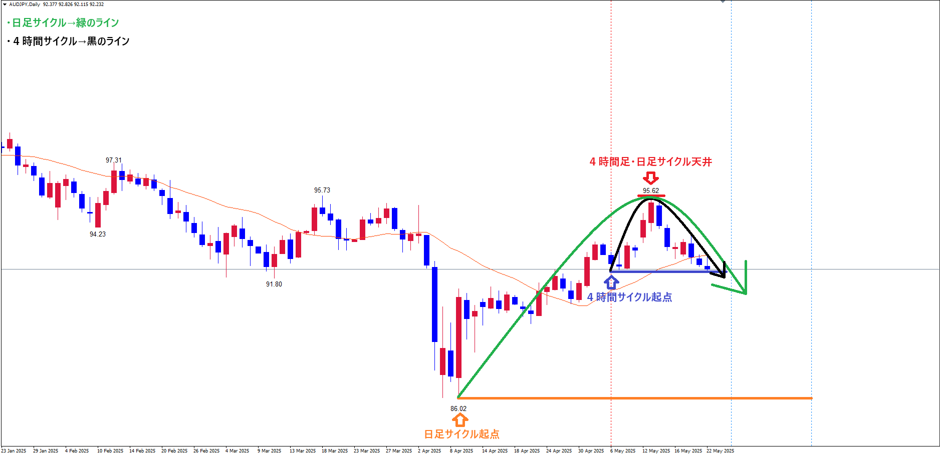 日足サイクルも現在は、赤のライン(5/13の高値95.62)で天井を付け、サイクル底へ向けて下落の波、方向感:下方向 という認識です✅